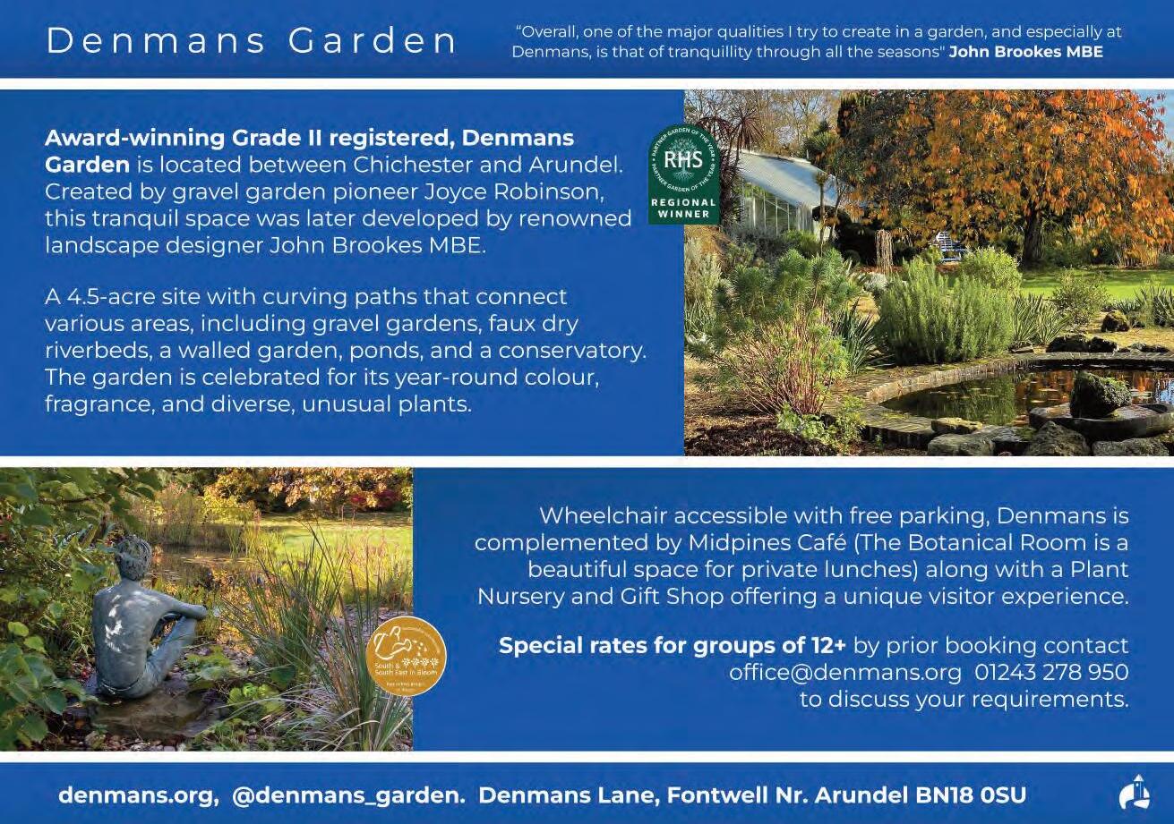 Denmans Garden is an award winning, historic garden at the foot of the South Downs. An oasis of calm, created by Joyce Robinson, a brilliant pioneer in gravel gardening, and developed by one of Britain’s most influential landscape designers, John Brookes MBE. Renowned for its curvilinear layout and complex plantings, here the vision and passion of horticulturalist and designer meld, resulting in a unique blend of horticultural diversity and extraordinary design. Year-round colour, structure and fragrance can be found in the gravel gardens, faux dry riverbeds, intimate Walled Garden,