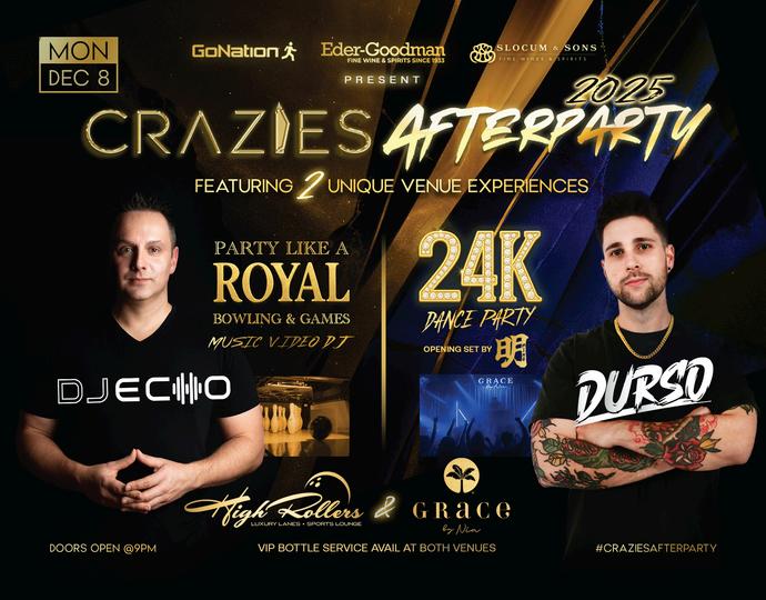 The After Party at High Rollers & Grace by Nia and is open only to CRAZIES ticket holders. You must show your CRAZIES wristband and ID for entry. 21+ only. This event is not open to the public.