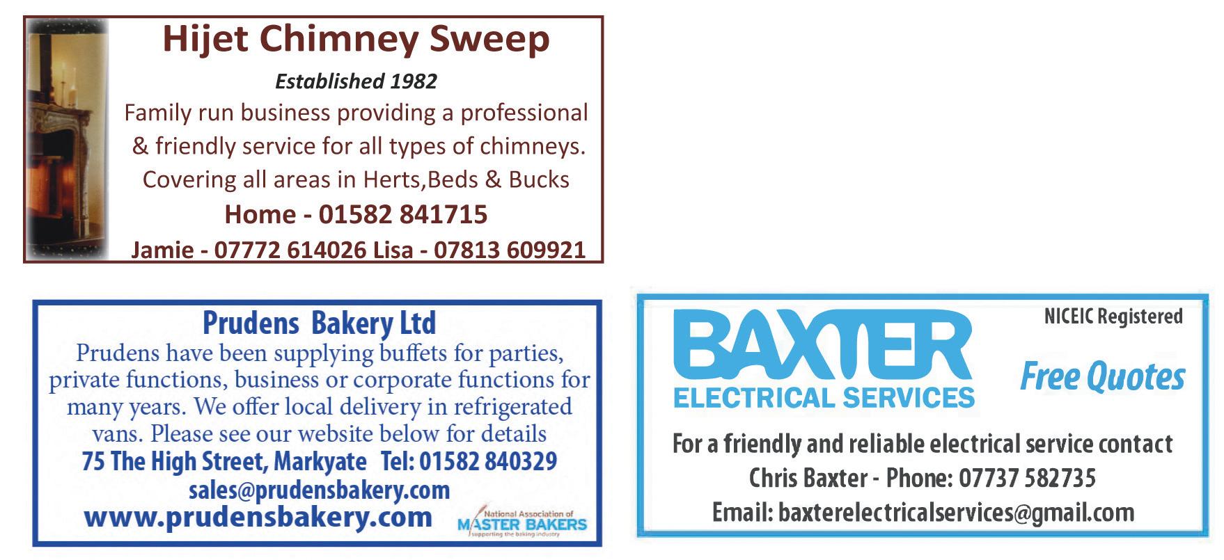 Ken France 01582 872375; Village Hall – Sam Burr 07921 761730