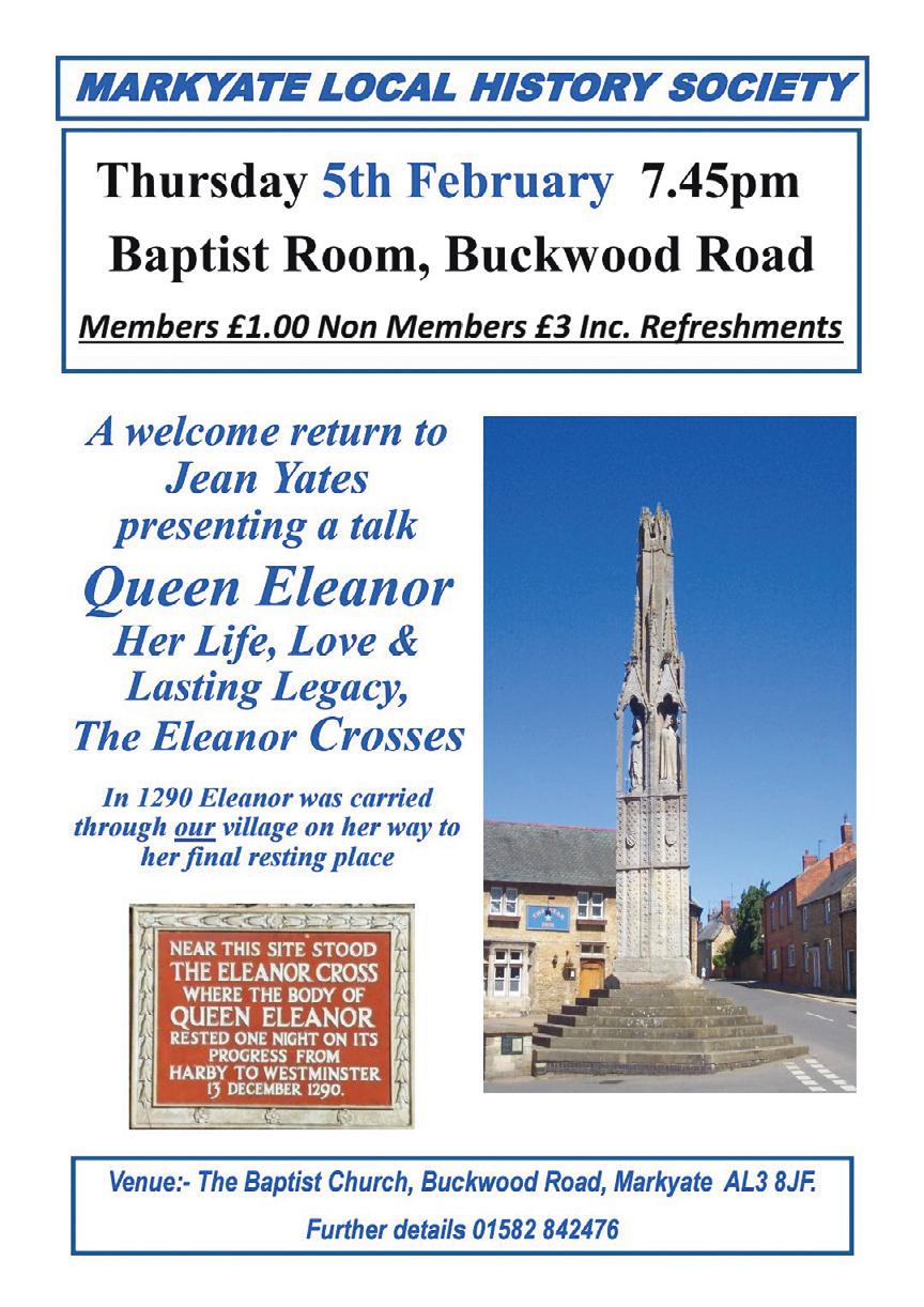 Please call Lin on 07969 322726 if you require further details. Markyate Local History Society meets with a speaker on the first Thursday of the month, Feb to April and Sept to Dec, at The Baptist Church Hall, Buckwood Road, Markyate AL3 8JF at 7.45pm. For more details phone David 07913 884256