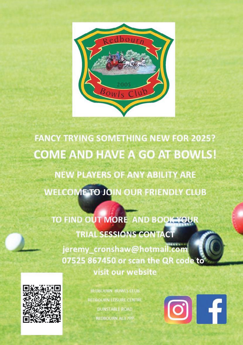 Redbourn Bowls Club always welcomes new members. If you would like more details, please contact Jacky Jenkins, Secretary, 07796 218537 Email: jackyjenkins1@gmail.com, or Jez Cronshaw, Coach, on 07525 867450.