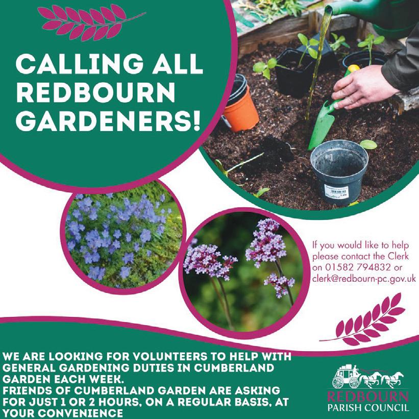 Redbourn’s Open Garden Weekend will take place this year on Saturday and Sunday, June 20 and 21. In you are interested in opening your garden in this popular biennial event, Redbourn in Bloom would love to hear from you. The gardens can be any size, wellestablished or still developing. Owners have the option of serving refreshments and/or having a fundraising if they wish. To find out