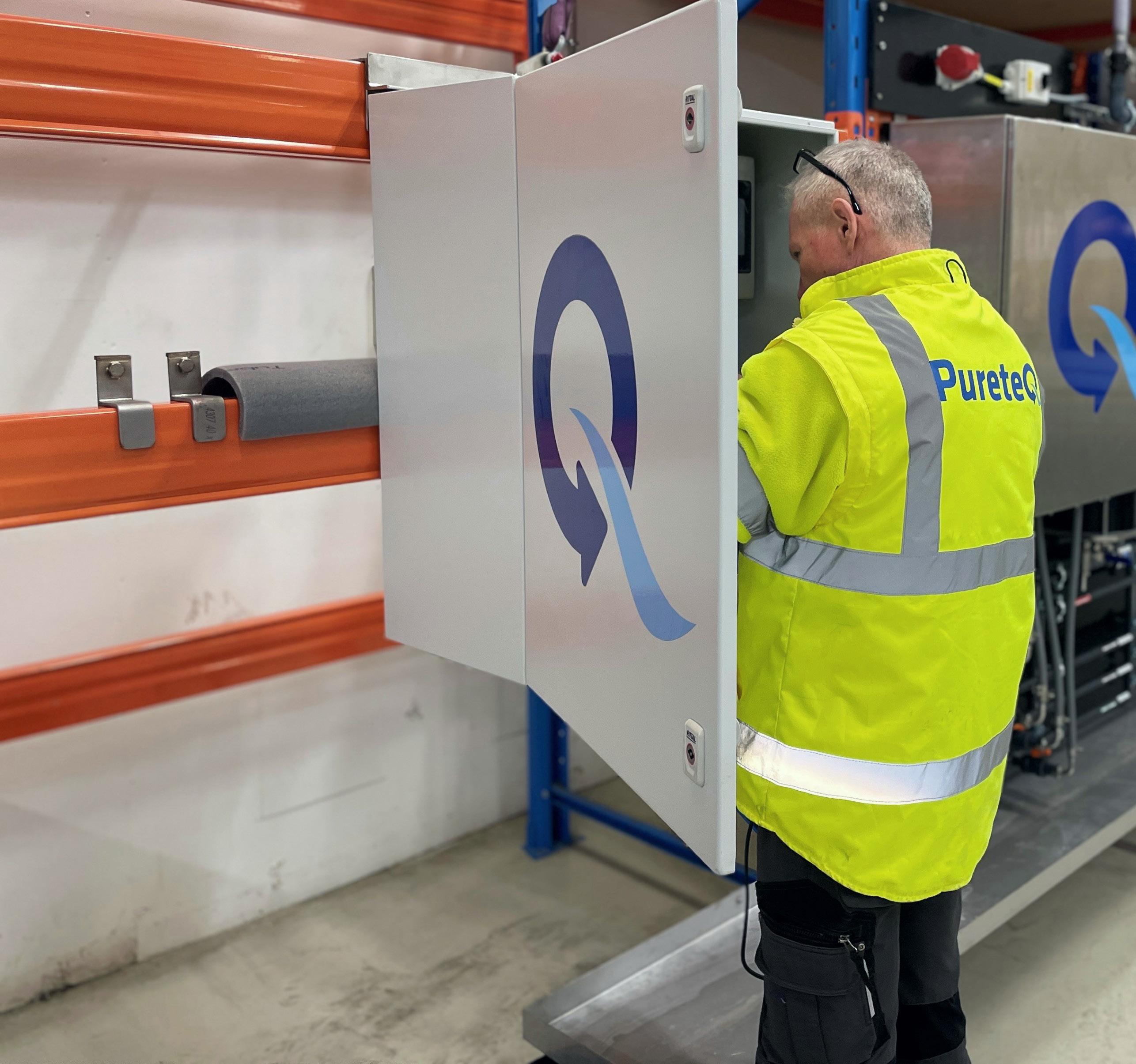 PureteQ WMS011 cabinet including user-friendly control system with software enabling retrofiting to existing EGR systems. The 7” touch screen displays pH, turbidity, PAH, flow and temperature.
