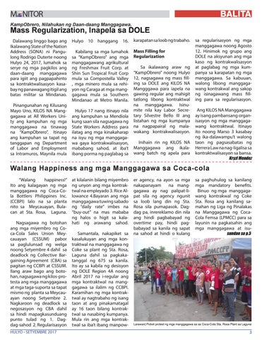 Walang Happiness ang mga Manggagawa sa Coca-cola “Walang happiness!” Ito ang kalagayan ng mga manggagawa ng Coca-Cola Bottlers Philippines Inc. (CCBPI) lalo na sa planta nito sa Meycauayan, Bulacan at Sta. Rosa, Laguna. Nagsagawa ng botohan ang mga miyembro ng Coca-Cola Sales Union Meycauayan (CSSUM) pabor sa paglulunsad ng welga noong Setyembre 4 dahil sa deadlock ng Collective Bargaining Agreement (CBA) sa pagitan ng CCBPI at CSSUM. Ilang araw bago ang botohan, nagsagawa ng kilos-protesta ang mga manggagawa at mga taga-suporta sa tapat mismo ng planta sa Meycauayan noong Setyembre 2. Nagkaroon ng deadlock sa negosasyon ng CBA dahil sa hindi mapagkasunduang punto tulad ng 1. Dagdag-sahod 2. Regularisasyon HULYO - SETYEMBRE 2017