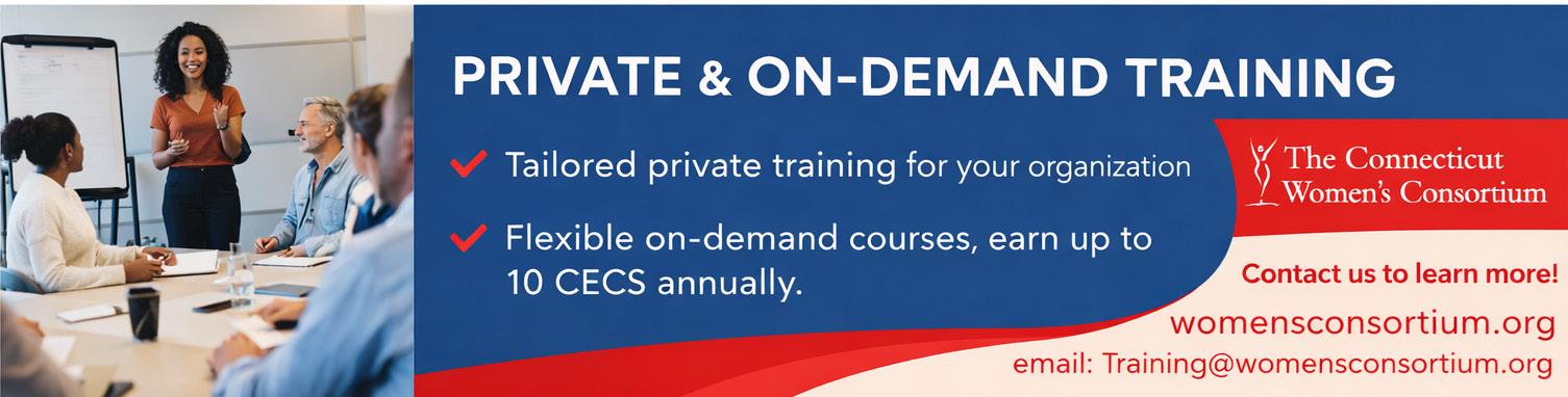 Complete the form on page 24 and mail with a check or money order. There is a $25 bank & handling fee for all returned checks. Failure to pay this fee will prevent you from registering for future courses. Checks and purchase orders are payable to The Connecticut Women’s Consortium and can be sent to ATTN: Education & Training, 2321 Whitney Avenue, Suite 401, Hamden, CT 06518