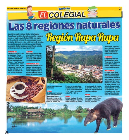 Las 8 regiones naturales La sétima región natural del Perú. La Región Rupa Rupa, también llamada ‘selva alta’ o ‘ceja de selva’, es según Javier Pulgar Vidal, una región en la vertiente oriental de los Andes peruanos entre los 400 msnm y los 1,000 msnm. El término selva alta es usado también con un significado extendido (todos los bosques del flanco oriental andino) que incluye la yunga oriental TOPONIMIA La palabra rupa – rupa procede del “Runa shimi” “Rhupha” que significa ‘ardiente’ o lo que ‘está caliente’. “Rupa – rupa” expresa la idea de ‘calor – fresco – calor’, o sea, aquel clima que “quema” en el día, refresca en la noche y vuelve a ‘arder’ al día siguiente.