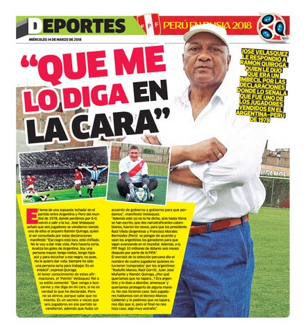 l tema de una supuesta ‘echada’ en el partido entre Argentina y Perú del mundial de 1978, donde perdimos por 6-0, volvió a salir a la luz. José Velásquez señaló que seis jugadores se vendieron siendo uno de ellos el arquero Ramón Quiroga, quien al ser consultado por estas declaraciones manifestó: "Ese negro está loco, está chiflado. No le voy a dar más vida. Para hacerla corta. Analiza los goles de Argentina. Soy una persona mayor, tengo nietos, tengo hijos acá y para escuchar a ese negro, no pues. No le quiero dar vida. Siempre he sido una persona seria para trabajar. Es un imbécil", expresó Quiroga. Al tener conocimiento de estas afirmaciones, el ‘Patrón’ Velásquez fiel a su estilo comentó: “Que venga a buscarme y me diga en mi cara, si no es verdad lo que he declarado. Pero no se atreve, porque sabe que no miento. Es un secreto a voces que seis jugadores en ese partido se vendieron, además que hubo un