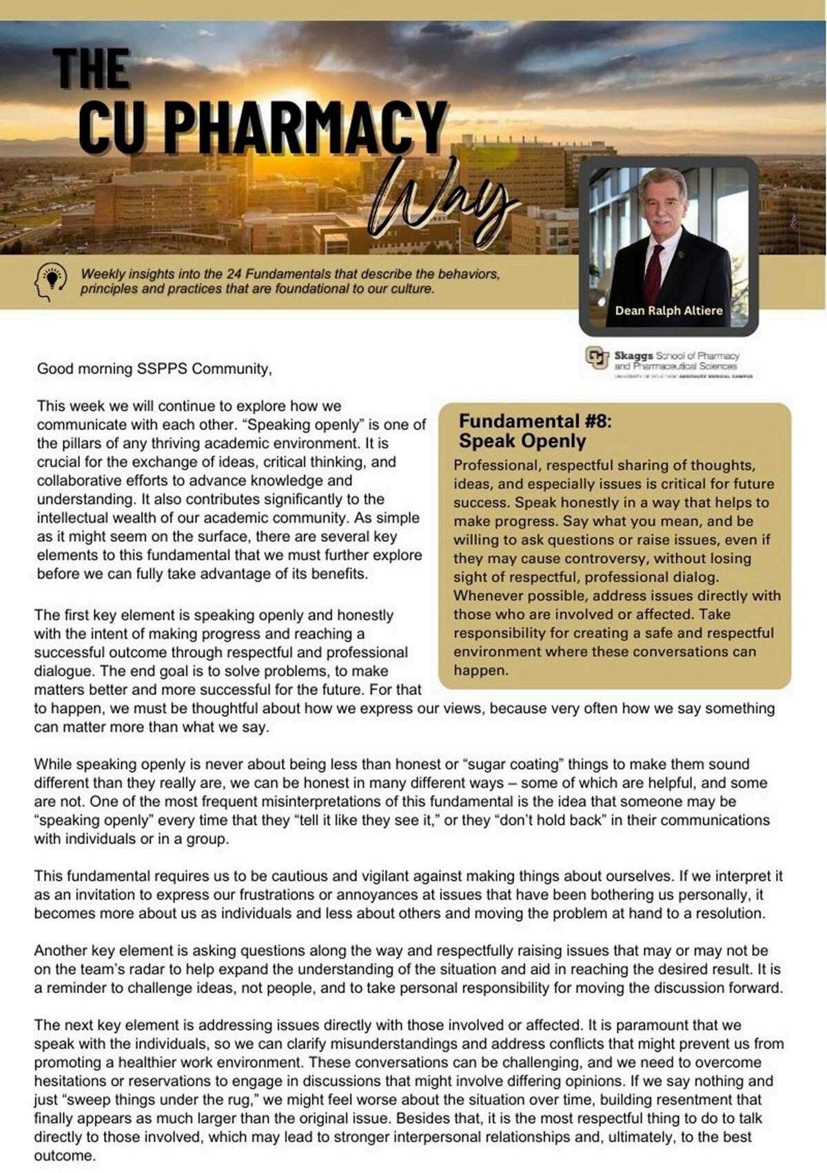 Periodically, it has been brought to my attention of instances when we have not been kind to each other, perhaps unintentionally, when we didn't select our words or actions with consideration of others. It is often not what we say but how we say it It's why "Act With Kindness" is our first fundamental to reflect on as we begin our CU Pharmacy Way journey together