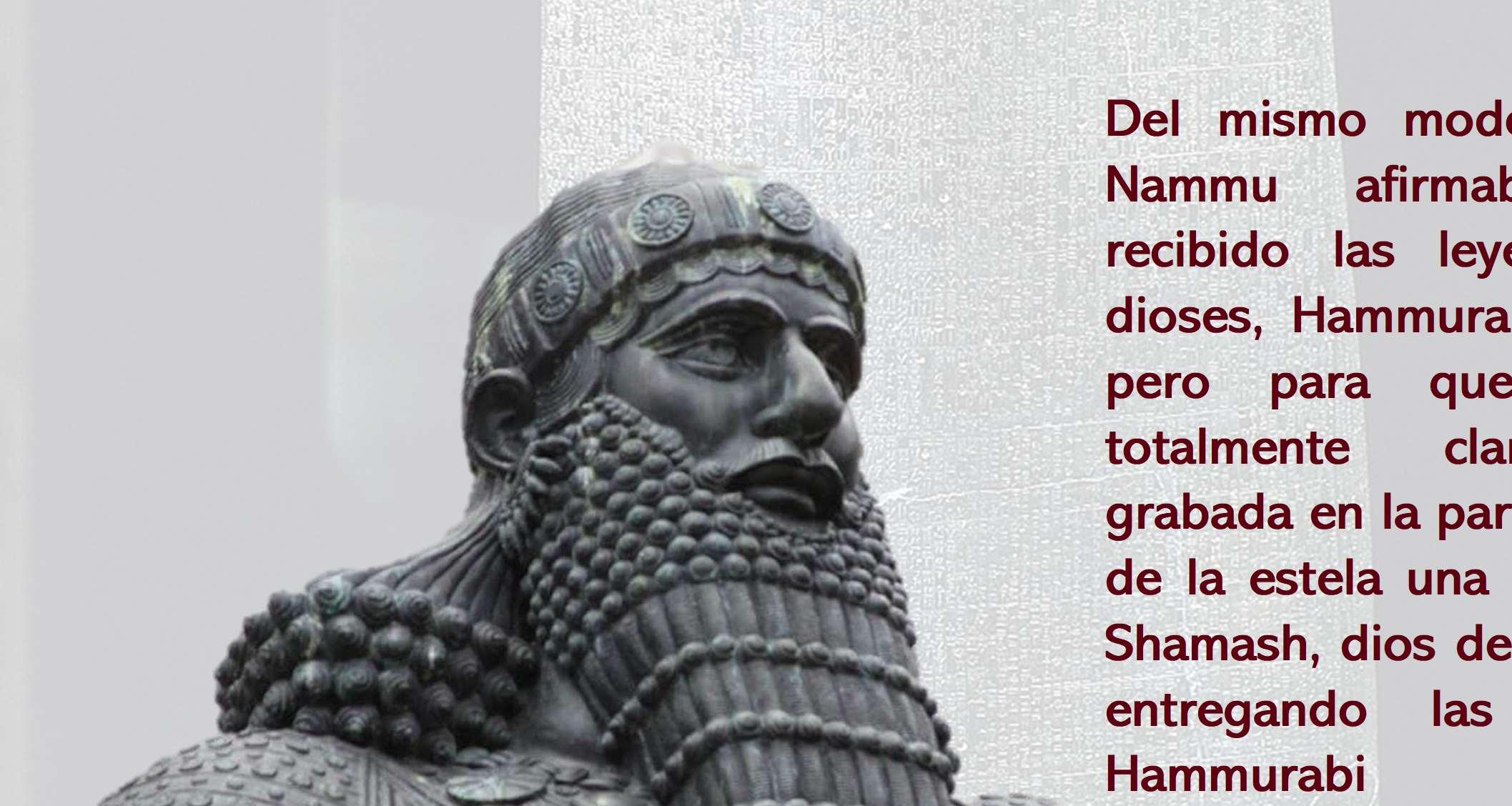 Del mismo modo que UrNammu afirmaba haber recibido las leyes de los dioses, Hammurabi lo hizo, pero para que quedara totalmente claro, dejó grabada en la parte superior de la estela una imagen de Shamash, dios de la justicia, entregando las leyes a