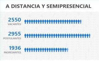 A DISTANCIA Y SEMIPRESENCIAL, con 2,550 vacantes ofertadas, que fueron demandadas por 2,955 postulantes, de los cuales ocuparon una plaza 1,936 ingresantes. En estas dos modalidades, de las 7,220 vacantes ofertadas (100%), fueron demandas por 13,928 postulantes que registran el 193%