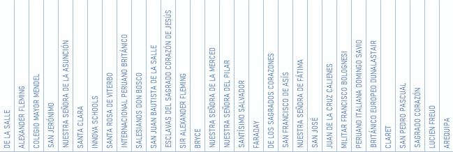 MILITAR FRANCISCO BOLOGNESI MICAELA BASTIDAS NUESTRA SEÑORA DEL PILAR SAN MARTÍN DE SOCABAYA 40038 JORGE BASADRE GROHMANN 40054 J.DOMINGO ZAMÁCOLA JAUREGUI 40164 JOSE CARLOS MARIATEGUI SANTO TOMÁS DE AQUINO (CIRCA) OTROS COLEGIOS /1