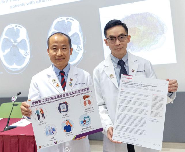 華人患者的腦出血治療成效研究 醫學院腦神經科最近完成全球首個針對心房顫動(又稱「房顫」)華人患者 的腦出血治療成效研究,比較他們在腦出血後使用「凝血酶原複合濃縮物治 療」(一種凝血因子製劑)與保守治療的成效。結果顯示,相較於保守治療, 凝血酶原複合濃縮物治療未能顯著改善華人房顫患者出現腦出血後的康復情 況,因此有迫切需要為腦出血患者尋求更佳的治療策略。研究 結果已於國際學術期刊《JAMA Network Open》發表。由於腦 出血患者出現嚴重後遺症、以至死亡的風險均很高,研究團隊 冀藉著 7 月 22 日「世界腦健康日」呼籲大眾,特別是房顫患者, 應嚴格管理可引致腦出血的風險因素及保持健康的生活模式。