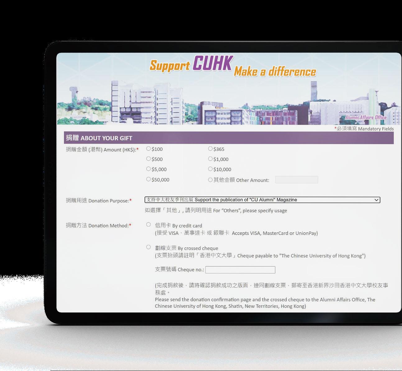 我們歡迎校友捐款,支持《中大校友》季刊出版, 而透過「校友網上捐款平台」,校友更可隨時透過