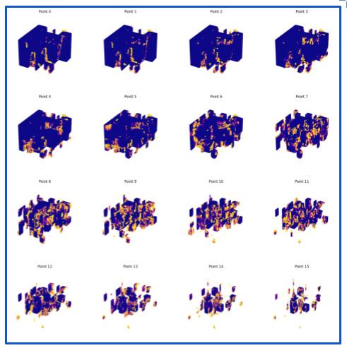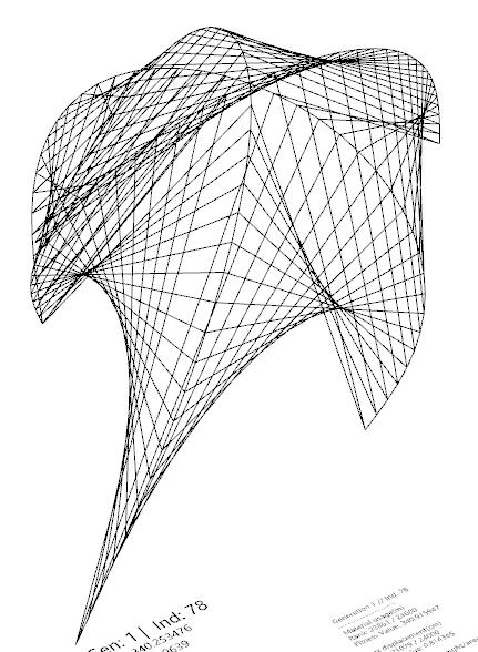 As the evolutionary direction moves closer to the fitness goal, in the last few generation results(for example generation199). The shape of each prototype is closer together, forming a similar cocoon shape. At same time, the material consumables and structural stability are optimized compared to the original generation results.