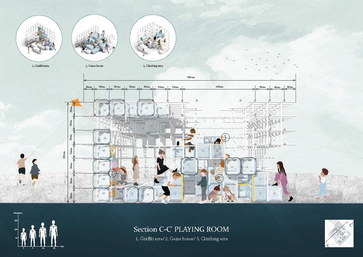 Sandy Hook shooting event lets people pay more attention to the Children protection. Comparing to teenagers who have more self-protection awareness, it is difficult for kids in kindergarten to protect themselves when they are in danger. Besides, children also face some increasing serious mentality problems. So, this project proposes a possible plan which can provide kids a useful protection in the school: when the danger is coming, channels around the building can let children exscape in a short time.These slide-like channels can take them into all kinds of irregular space which become a shelter for the moment. In normal times, as a relatively closed entertainment space, the irregular space can help children keep away from annoying reality and create a no teachers' pressure, completely free world.