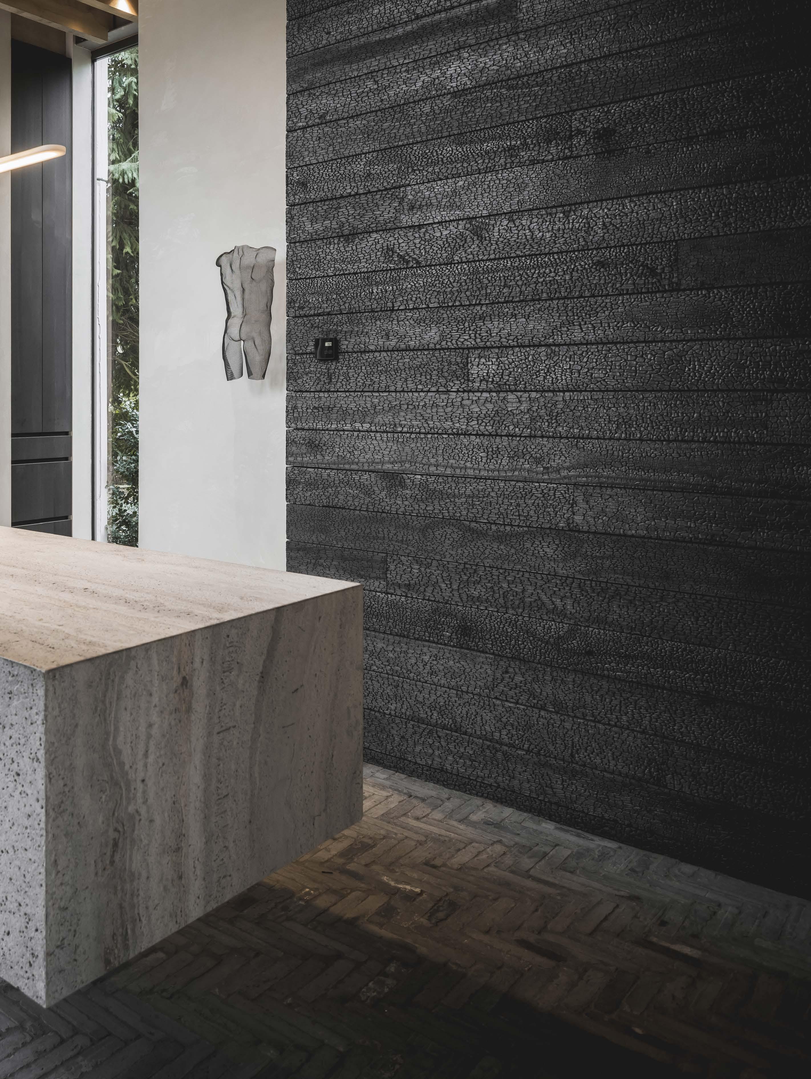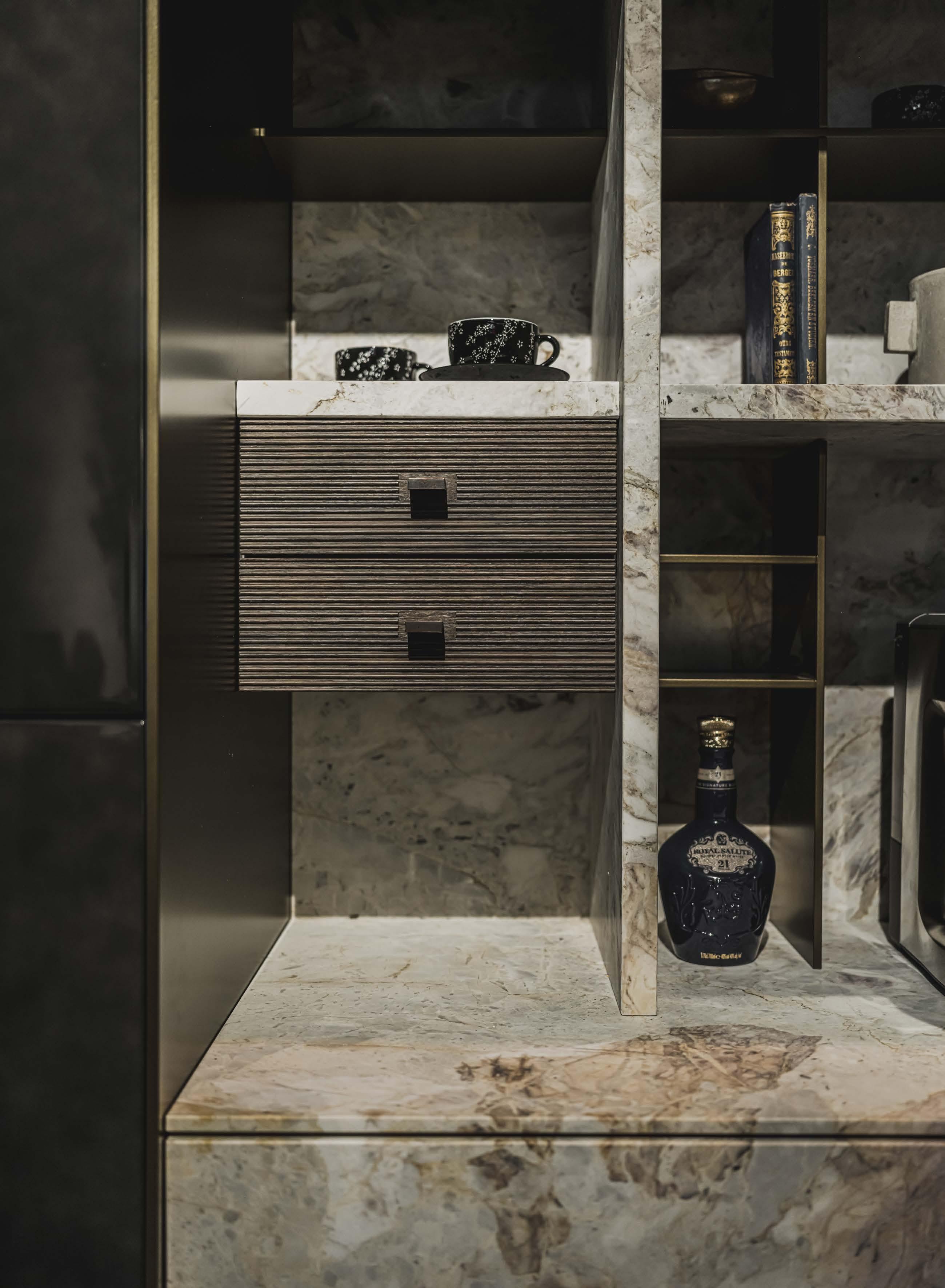 DIEPE, RIJKE MARMER, TERWIJL STRAKKE VERSTEKLIJNEN SPANNING TOEVOEGEN AAN HET GEHEEL.