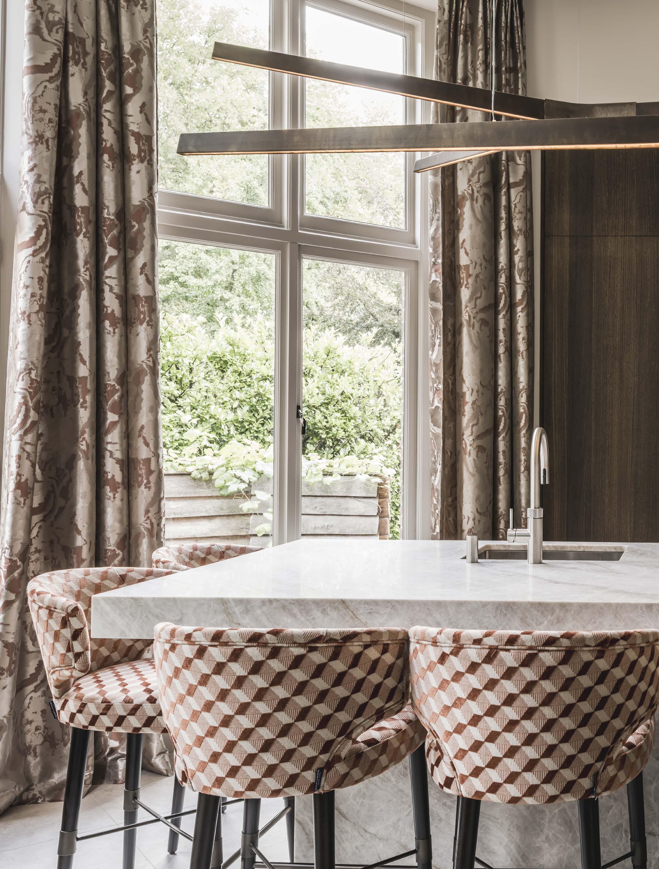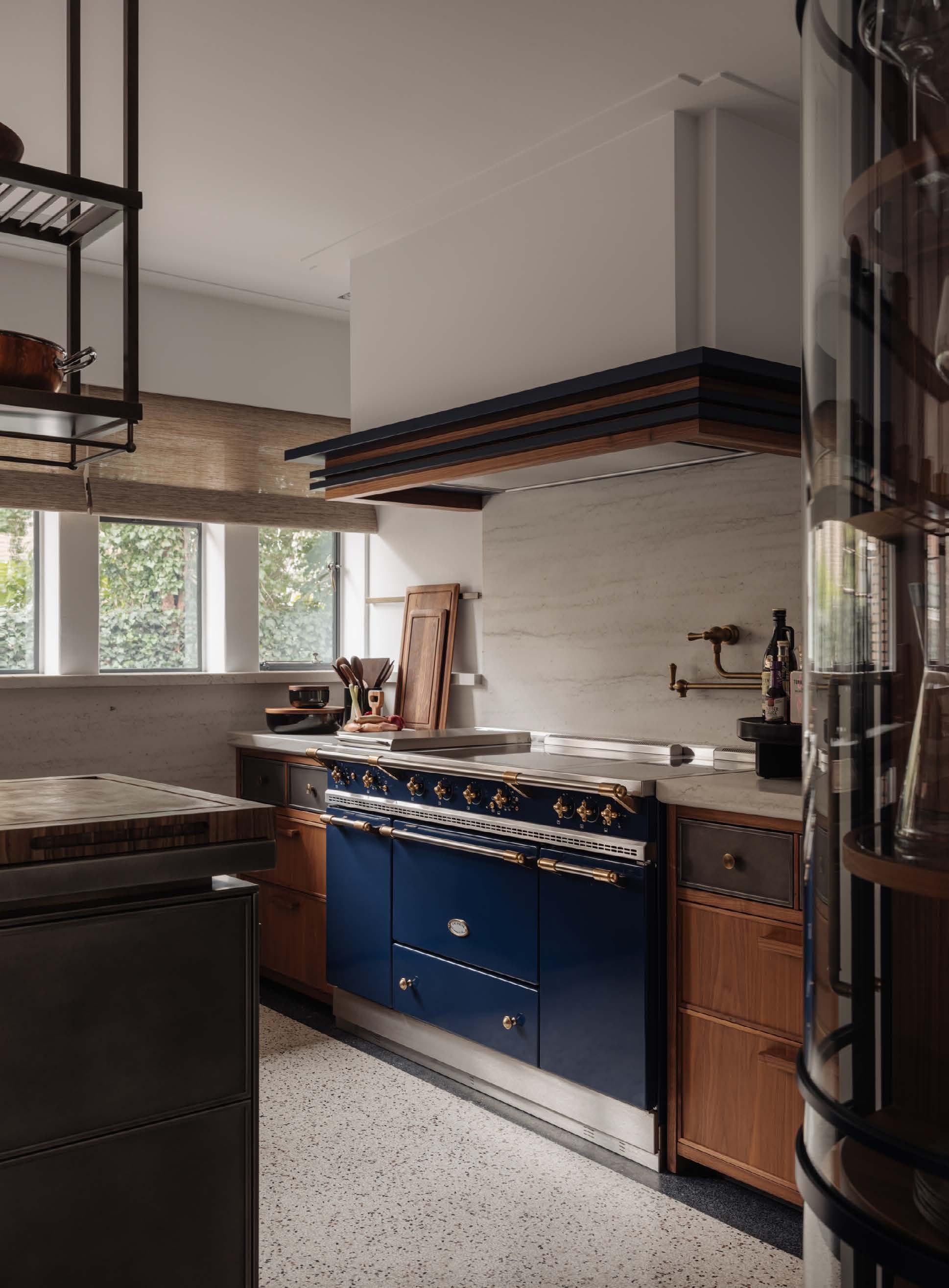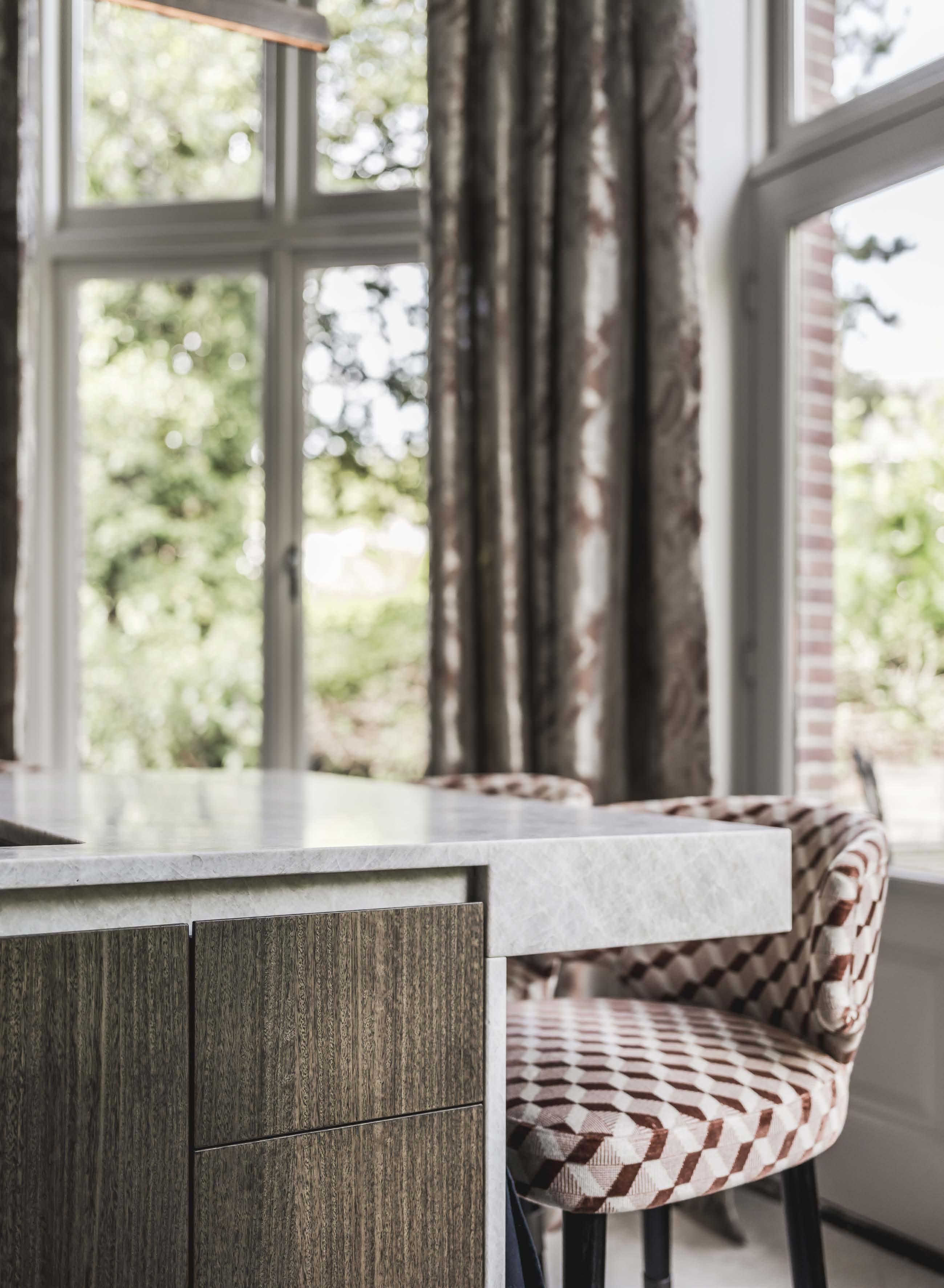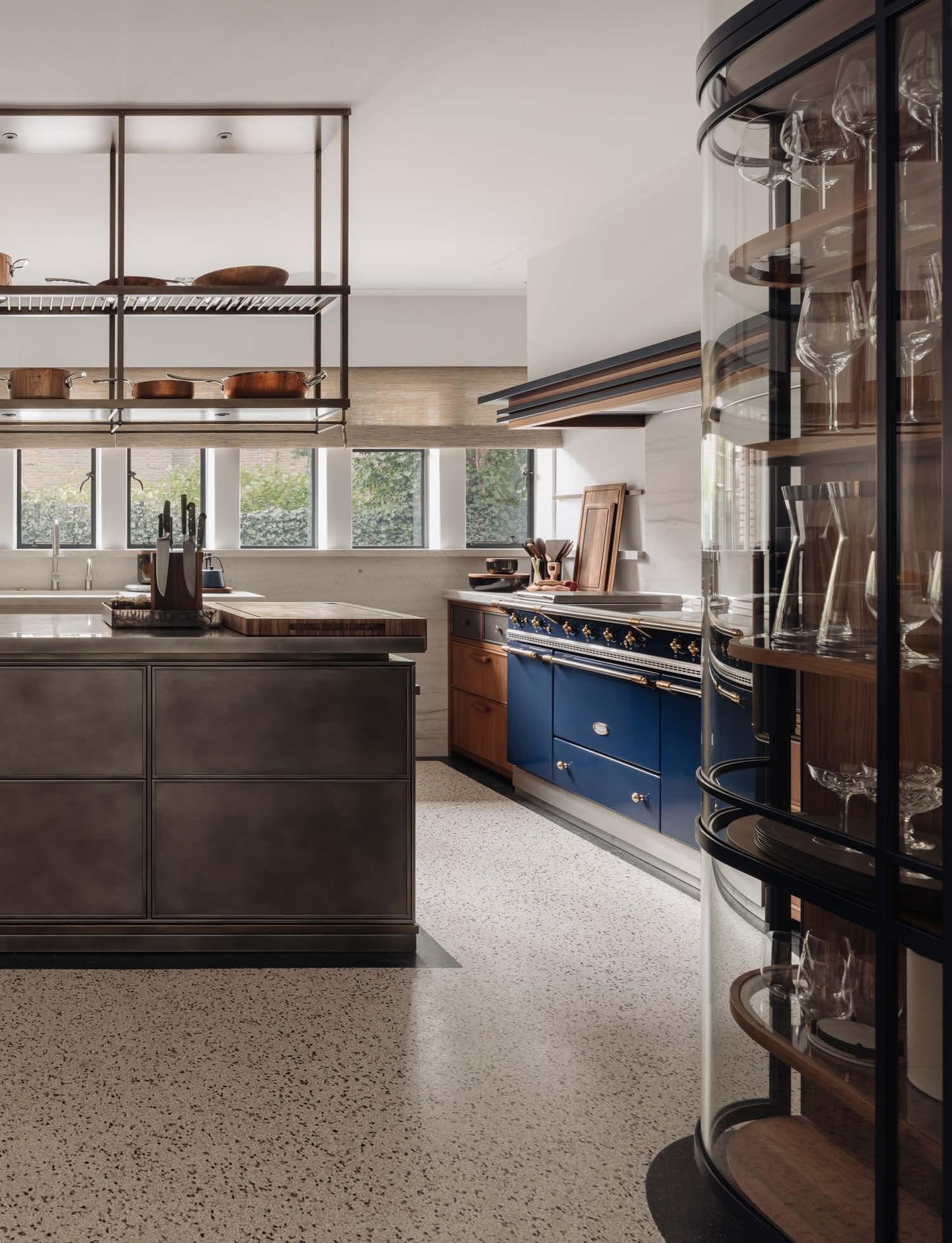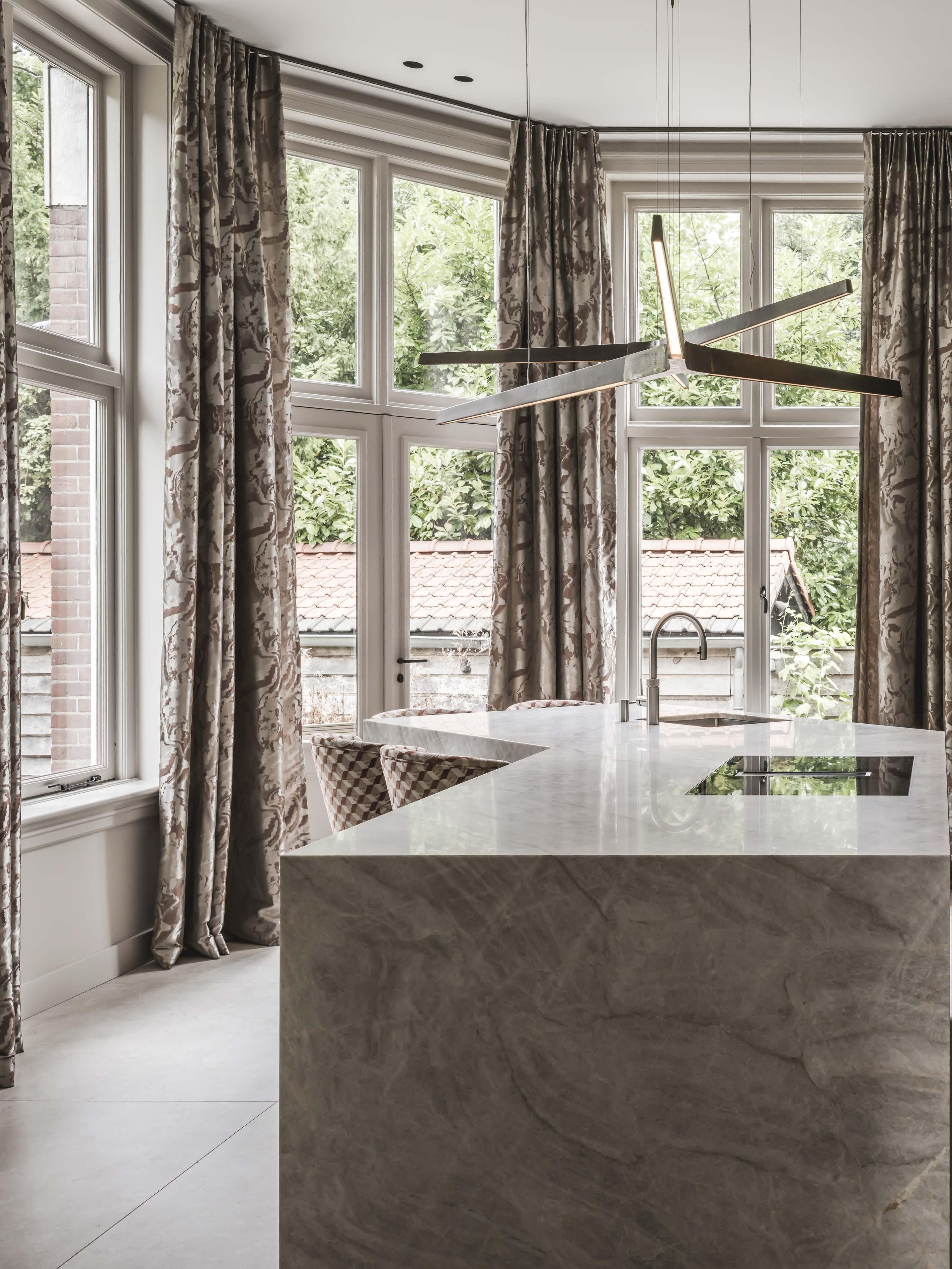 In deze Nieuwe Haagse School-villa, in 1929 ontworpen door architect Dirk Roosenburg, vond de keuken haar vorm in de oorspronkelijke architectuur. De karakteristieke detaillering werd vertaald naar een eigentijdse vormentaal, met behoud van de authentieke sfeer. De kenmerkende diepe blauwe kleur van de buitenzijde keert terug in het fornuis, de vensterbanken en de schouw, waardoor een subtiele dialoog ontstaat tussen binnen en buiten. Terwijl het gebruik van tin, warme houttinten en natuursteen zorgt voor een tijdloze uitstraling.