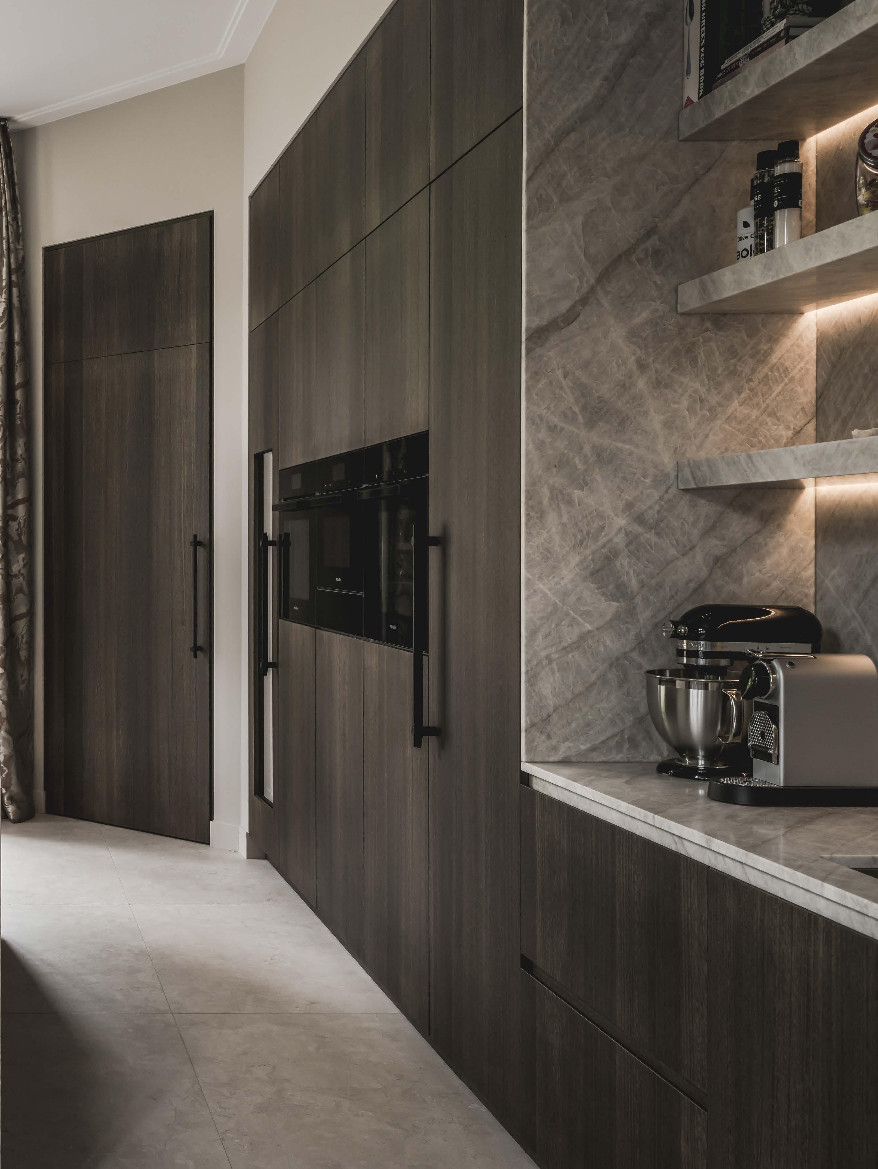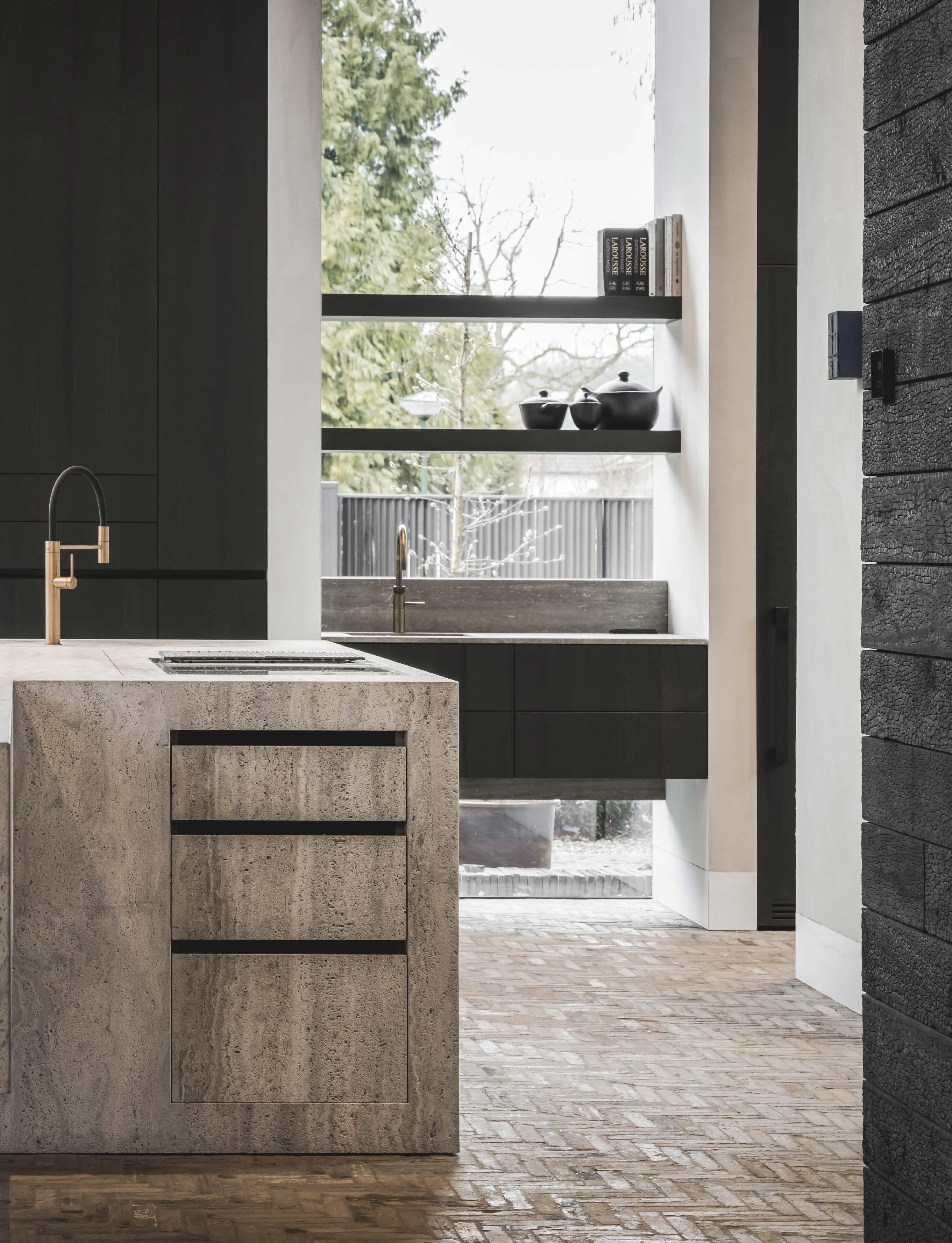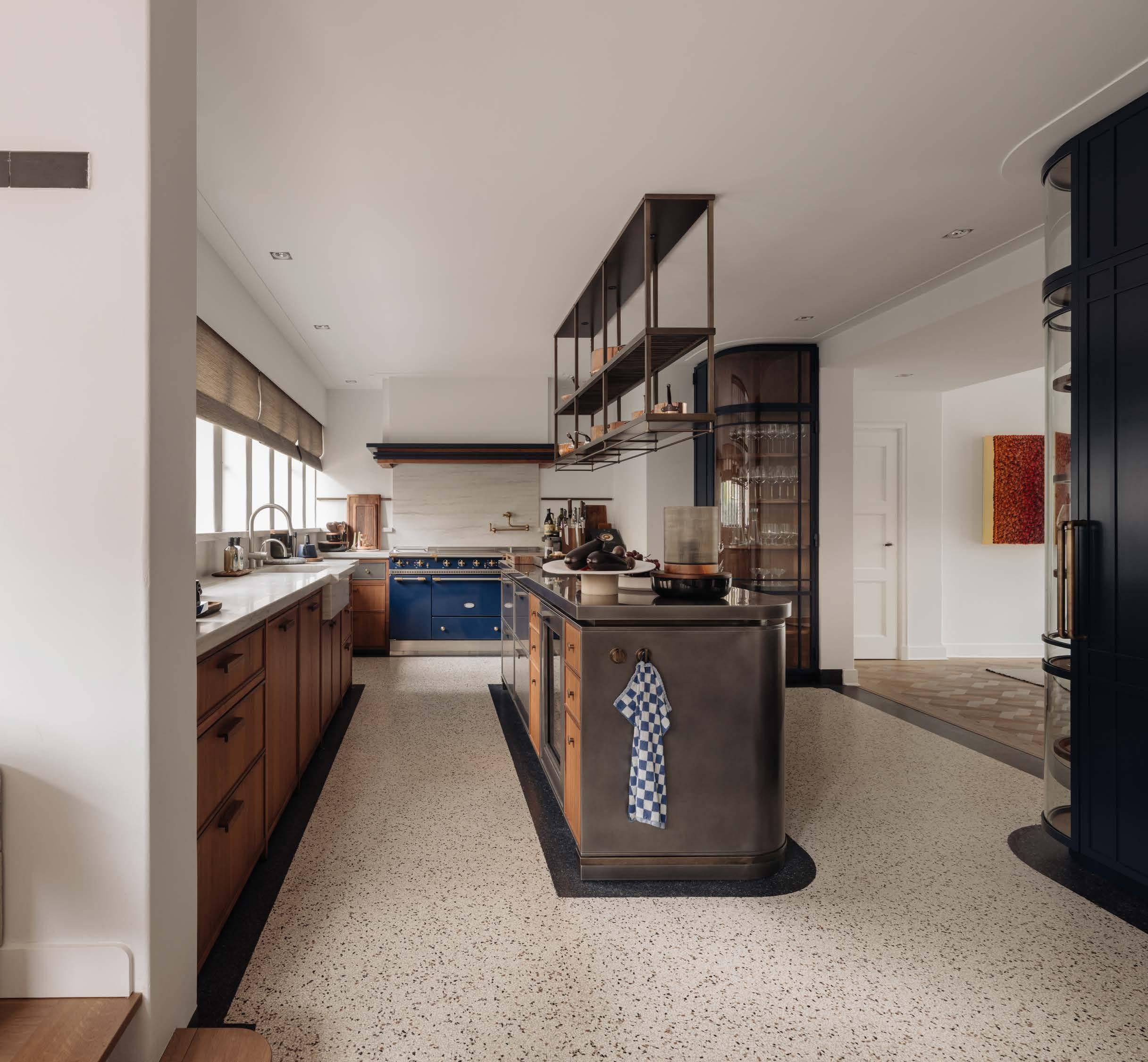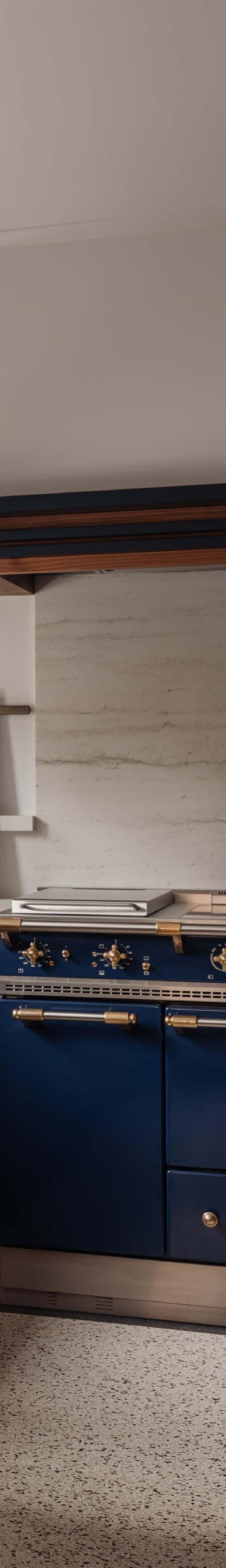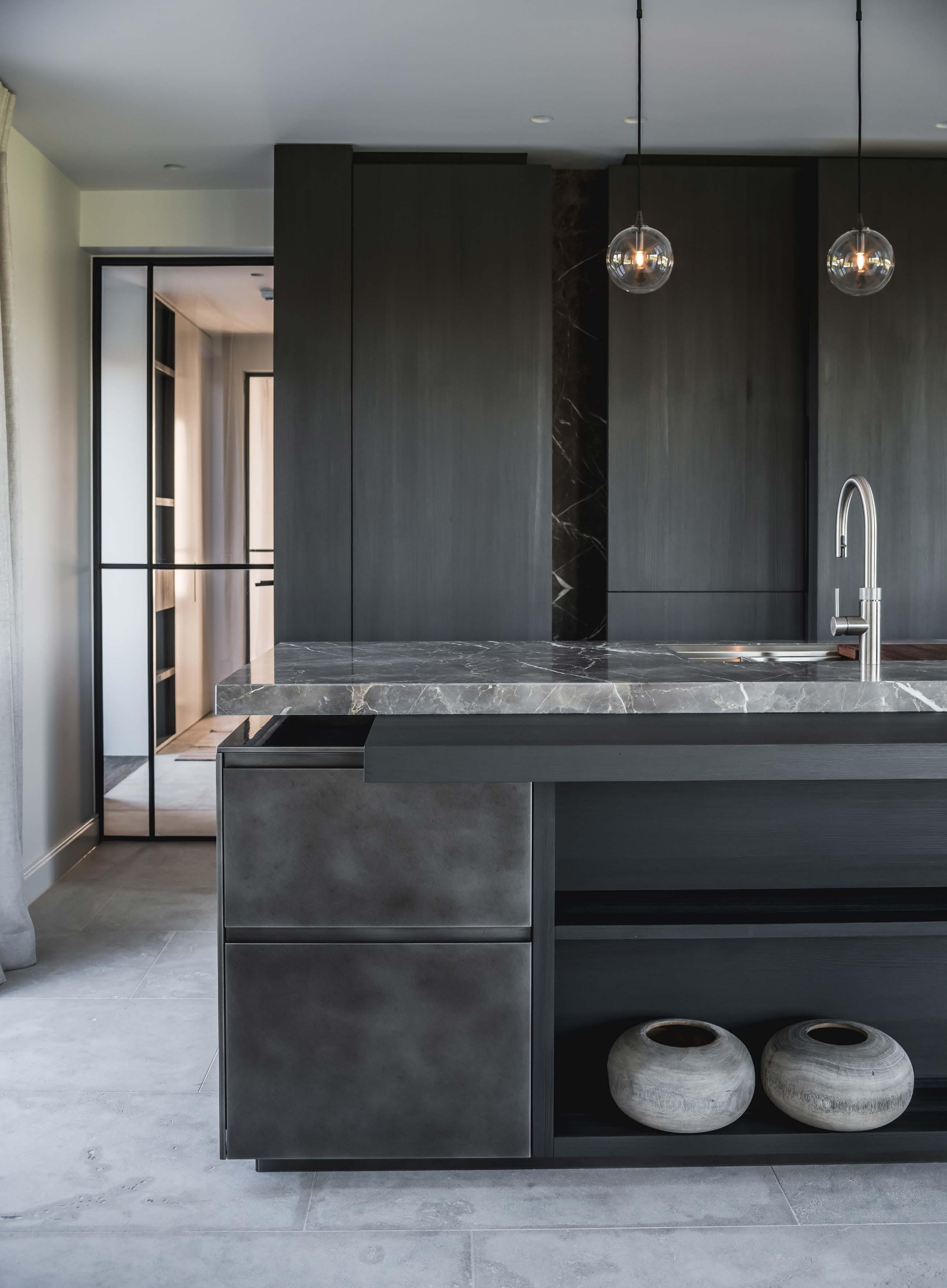 In deze Nieuwe Haagse School-villa, in 1929 ontworpen door architect Dirk Roosenburg, vond de keuken haar vorm in de oorspronkelijke architectuur. De karakteristieke detaillering werd vertaald naar een eigentijdse vormentaal, met behoud van de authentieke sfeer. De kenmerkende diepe blauwe kleur van de buitenzijde keert terug in het fornuis, de vensterbanken en de schouw, waardoor een subtiele dialoog ontstaat tussen binnen en buiten. Terwijl het gebruik van tin, warme houttinten en natuursteen zorgt voor een tijdloze uitstraling.