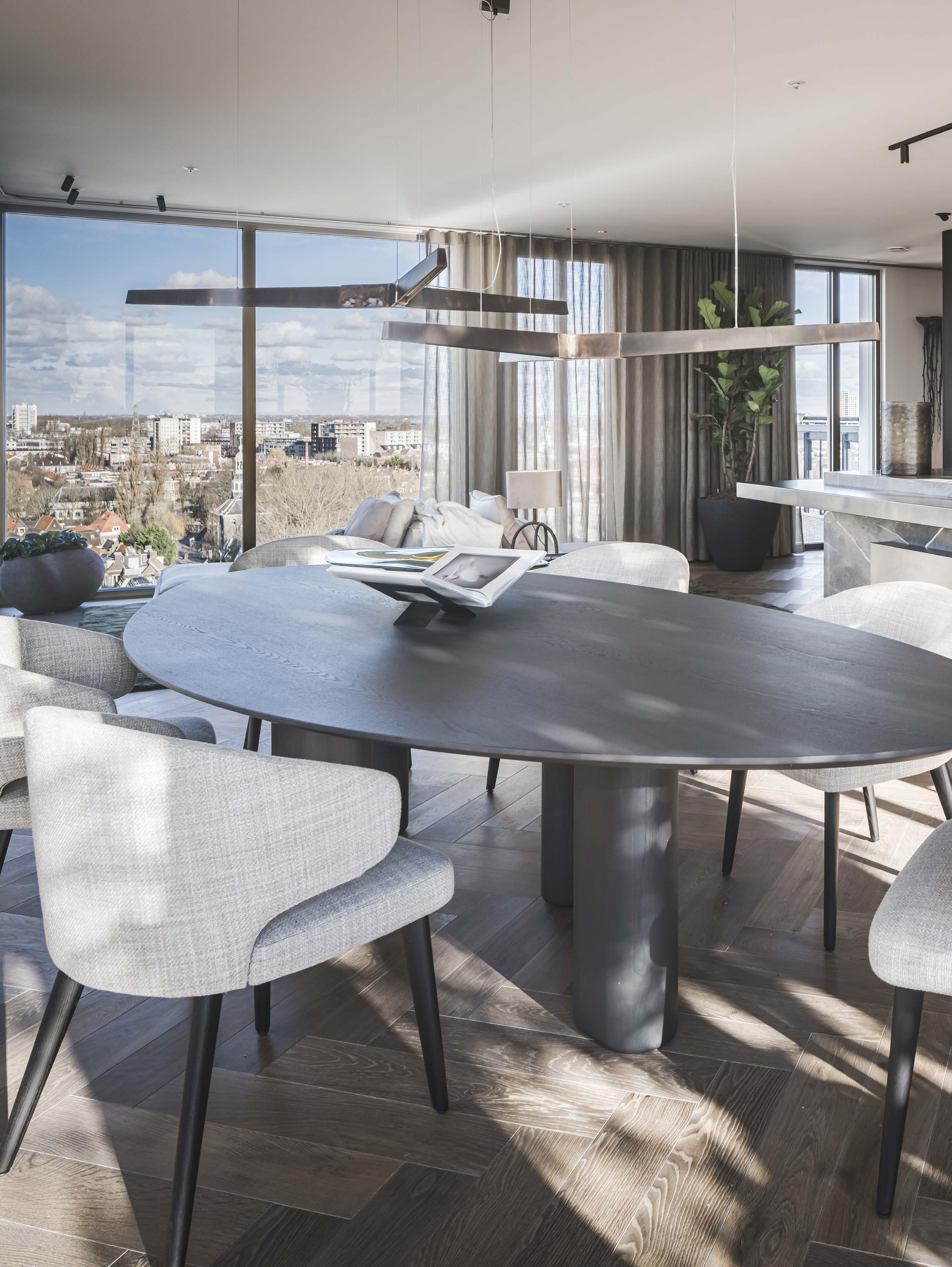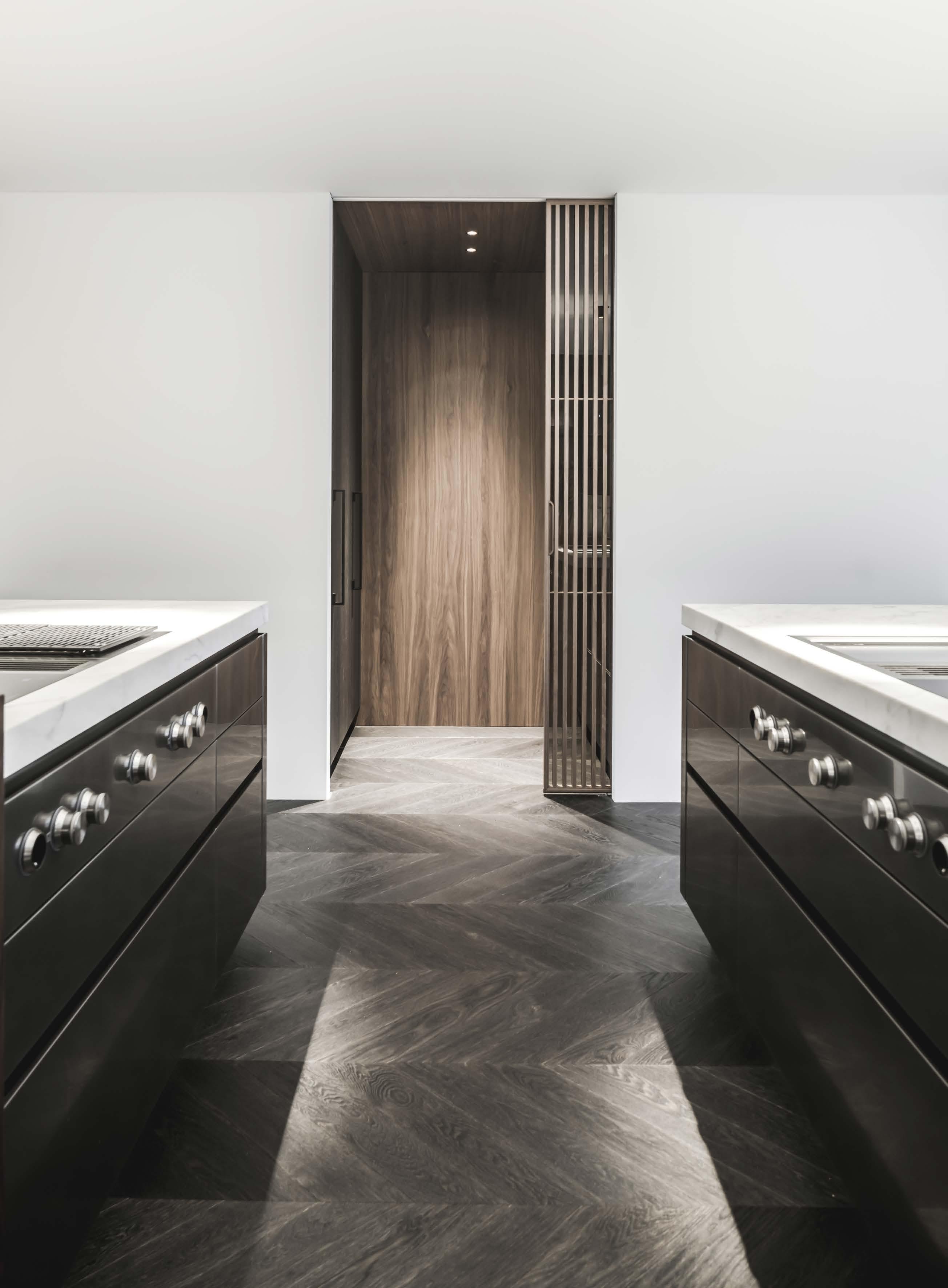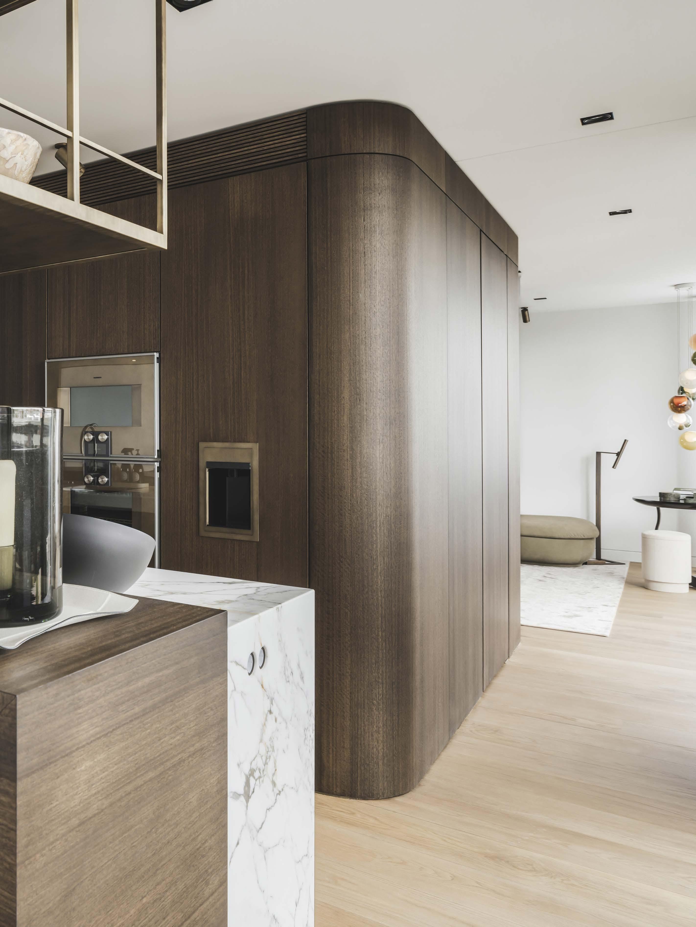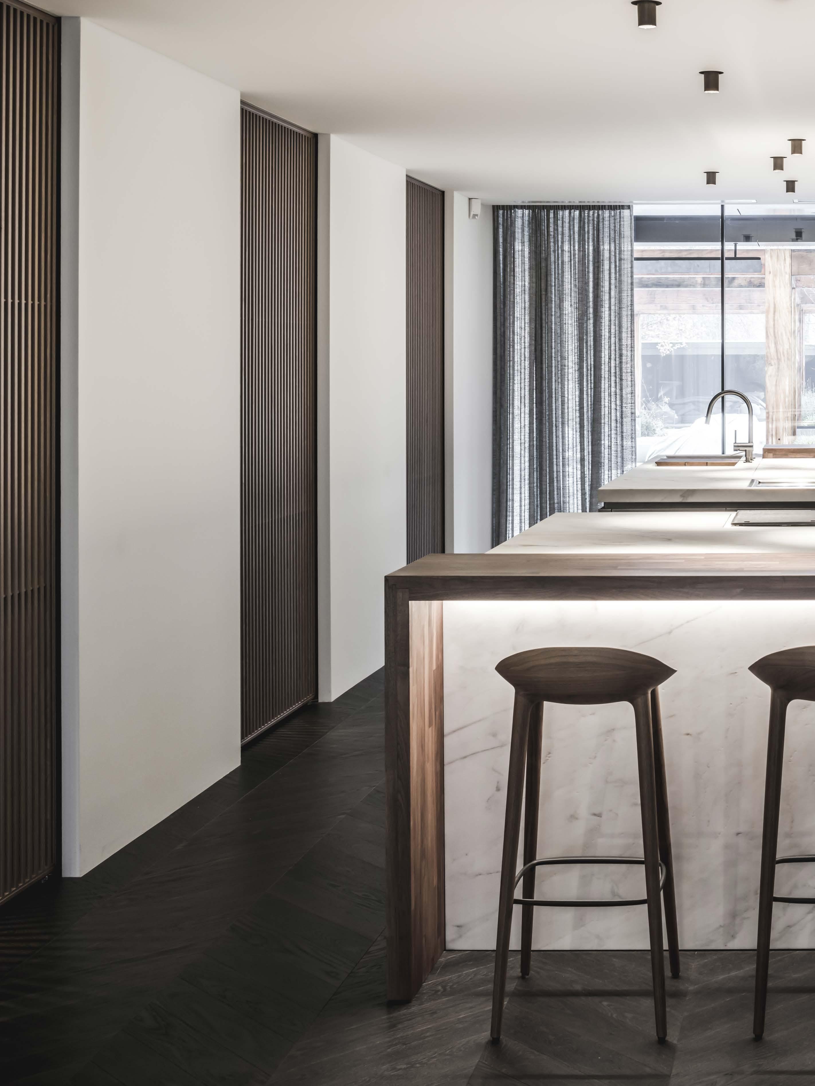 ‘’WE HEBBEN ER BEWUST VOOR GEKOZEN OM DE KASTEN EXTRA HOOG UIT TE VOEREN OM DE HOOGTE VAN DE RUIMTE TE BENADRUKKEN. HET STOND VOOR ONS VOOROP OM DEZE HOGE DEUREN UIT ÉÉN STUK UIT TE VOEREN. DAAROM HEBBEN WE VOOR DE REALISATIE SPECIALE METERSLANGE BOMEN GESELECTEERD.’’