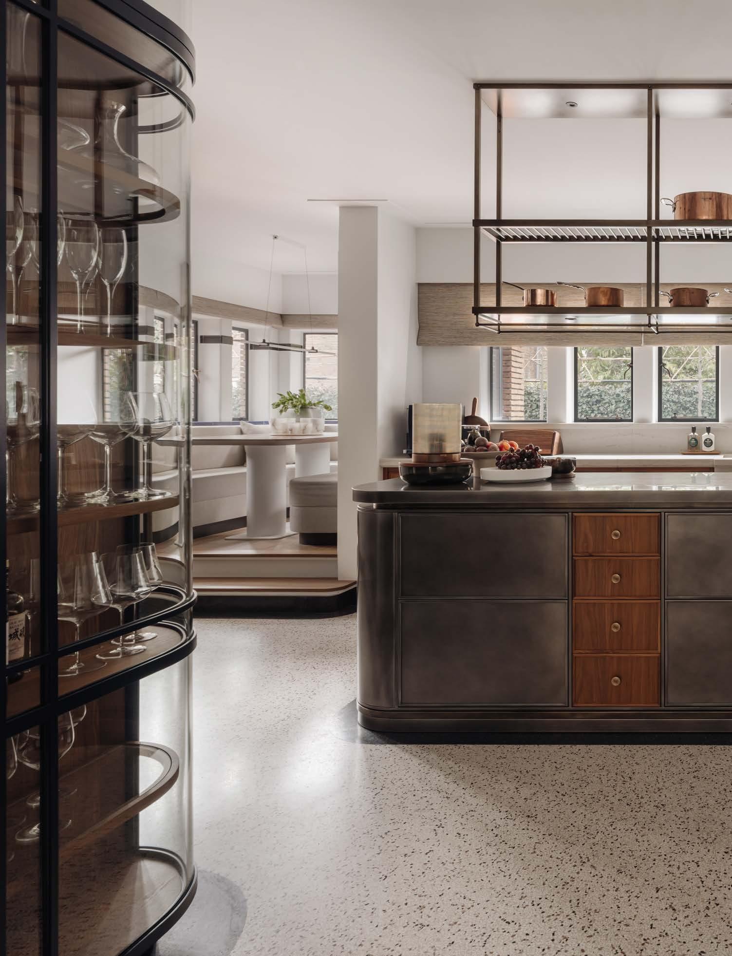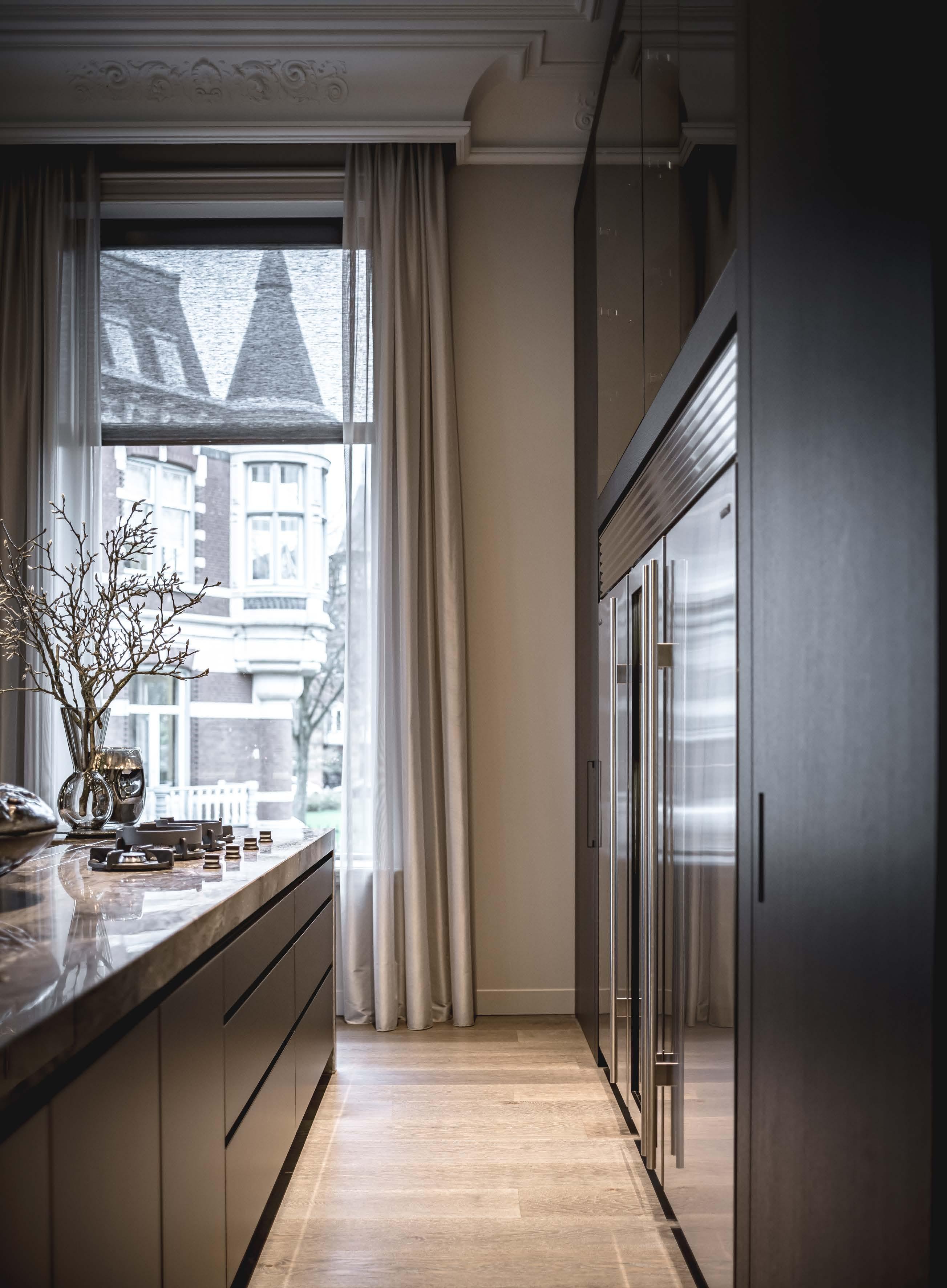 Van buiten naar binnen loopt een duidelijke lijn: kleurstelling en belijning sluiten naadloos aan bij de gevel en oorspronkelijke details van het pand. Het ronde glas in de vitrinekasten herhaalt de elegante lijnen van het exterieur, terwijl echt messing accenten – van grepen tot details rond het fornuis – een warme gloed en verfijnde luxe toevoegen. Het resultaat is een keuken waar historische charme en moderne functionaliteit moeiteloos samenkomen.