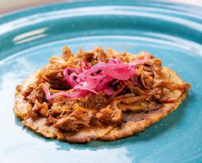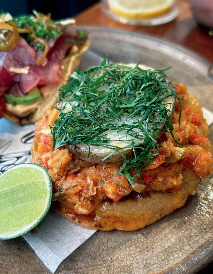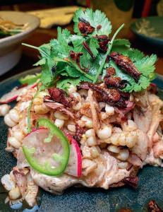 Tostada de pulpo, esquites y chapulines, chef Vidal Elías Murillo, Micaela Mar y Leña Mérida, Yucatán.