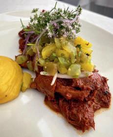 de setas con relish de piña y puré de plátano macho, chef Quetzalcoátl Zurita, restaurante Almoraduz, Puerto Escondido, Oaxaca.