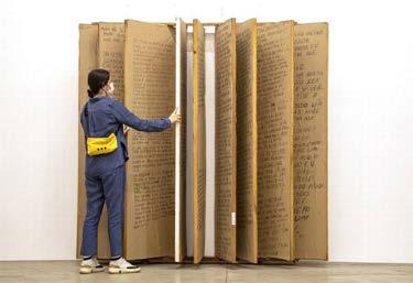 Ana Coelho and Deize Tigrona, artists from Brazil, work together to create a sculpture that also functions as a book. They used recycled doors like book pages to write a story that mixes fiction with real-life events.