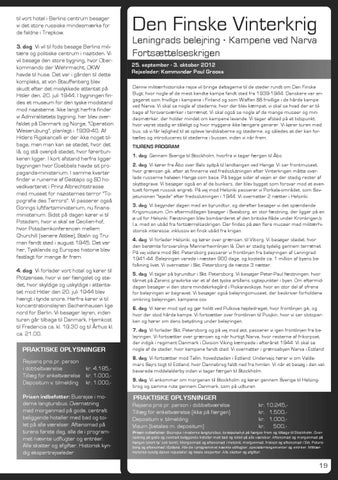 Den Finske Vinterkrig Leningrads belejring · Kampene ved Narva Fortsættelseskrigen 25. september - 3. oktober 2012 Rejseleder: Kommandør Poul Grooss Denne militærhistoriske rejse vil bringe deltagerne til de steder rundt om Den Finske Bugt, hvor nogle af de mest kendte kampe fandt sted fra 1939-1944. Danskere var engageret som frivillige i kampene i Finland og som Waffen SS frivillige i de hårde kampe ved Narva. Vi skal se nogle af stederne, hvor der blev kæmpet, vi skal se hvad der er tilbage af forsvarsværker i terrænet. Vi skal også se nogle af de mange museer og mindesmærker, der holder mindet om kampene levende. Vi tager afsted på et tidspunkt, hvor vejret stadig er tåleligt og hvor myggene ikke længere generer. Vi kører turen med bus, så vi får lejlighed til at opleve landskaberne og stederne, og således at der kan fortælles og introduceres til stederne i bussen, inden vi når frem. TIURENS PROGRAM 1. dag Gennem Sverige til Stockholm, hvorfra vi tager færgen til Åbo 2. dag Vi kører fra Åbo over Salo sydpå til landtangen ved Hangø. Vi ser frontmuseet, hvor grænsen gik, efter at finnerne ved fredsslutningen efter Vinterkrigen måtte overlade russerne halvøen Hangø som base. På begge sider af vejen er der stadig rester af skyttegrave. Vi besøger også en af de bunkers, der blev bygget som forsvar mod et eventuelt fornyet russisk angreb. På vej mod Helsinki passerer vi Porkala-området, som Sovjetunionen "lejede" efter fredsslutningen i 1944. Vi overnatter 2 nætter i Helsinki. 3. dag Vi begynder dagen med en byrundtur, og derefter besøger vi det spændende Krigsmuseum. Om eftermiddagen besøger i Sveaborg, en stor fæstning, der ligger på en ø ud for Helsinki. Fæstningen blev bombarderet af den britiske flåde under Krimkrigen,b l.a. med en ubåd fra fortsærrelseskrigen. Der findes på øen flere museer med militærhistorisk interesse, inklussiv en finsk ubåd fra krigen. 4. dag Vi forlader Helsinki, og kører over grænsen, til Viborg. Vi besøger stedet, hvor den berømte forsvarslinje Mannerheimlinjen lå. Den er stadig tydelig gennem terrænet. På vej videre mod Skt. Petersborg passerer vi frontlinjen fra belejringen af Leningrad 1941-44. Belejringen varede i næsten 900 dage, og kostede ca. 1 million af byens befolkning livet. Vi overnatter i Skt. Petersborg de næste 3 nætter. 5. dag Vi tager på byrundtur i Skt. Petersborg. Vi besøger Peter-Paul fæstningen, hvor tårnet på Zarens gravkirke var et af det tyske artilleris sigtepunkter i byen. Om eftermiddagen besøger vi den store mindekirkegård i Piskarevskoye, hvor en stor del af ofrene for belejringen er begravet. Vi besøger også belejringsmuseet, der beskriver forholdene omkring belejringen, kampene osv. 6. dag Vi kører mod syd og gør holdt ved Pulkova højdedraget, hvor frontlinjen gik, og hvor der stod hårde kampe. Vi fortsætter over frontlinien til Pusjkin, hvor vi ser slotsparken og hører om dens betydning under belejringen. 7. dag Vi forlader Skt. Petersborg og på vej mod øst, passerer vi igen frontlinjen fra belejringen. Vi fortsætter over grænsen og når hurtigt Narva, hvor resterne af frikorpset, der indgik i regiment Danmark i Division Viking kæmpede i efteråret 1944. Vi skal se nogle af de steder, hvor kampene fandt sted. Vi overnatter i grænsebyen Narva i Estland 8. dag Vi fortsætter mod Tallin, hovedstaden i Estland. Undervejs hører vi om Valdemars Sejrs togt til Estland, hvor Dannebrog faldt ned fra himlen. Vi når et besøg i den velbevarede middelalderby inden vi tager færgen til Stockholm. 9. dag Vi ankommer om morgenen til Stockholm og kører gennem Sverige til Helsingbrog og samme rute gennem Danmark, som på udturen.