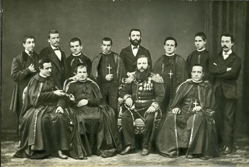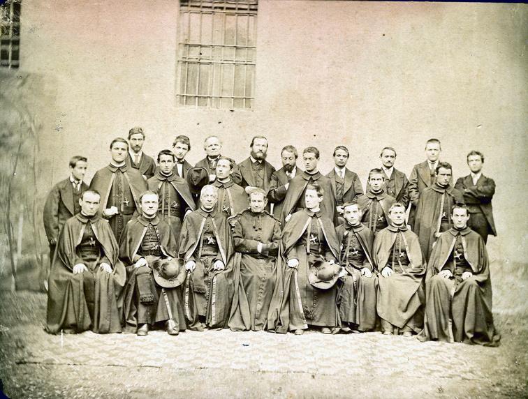En el año 1870 fue tomada esta foto con algunos de los primeros salesianos Destaco a la derecha de Don Bosco, por orden, a Don Giacomo Costamgna, Don Giovanni Cagliero y Don Celestino Durando. También destaca Don Giulio Barberis, segundo de abajo, comenzando por la izquierda de la foto, entre otros aún no identificados