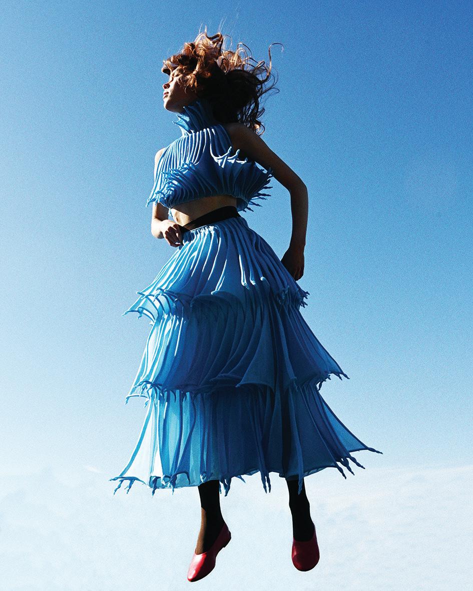 from houses including Prada, Balenciaga, and Loewe. “[We played] with the idea of overcoming gravity, which, of course, is an absurd endeavor on planet Earth. Yet the struggle against it gave rise to images full of power and fluidity.”