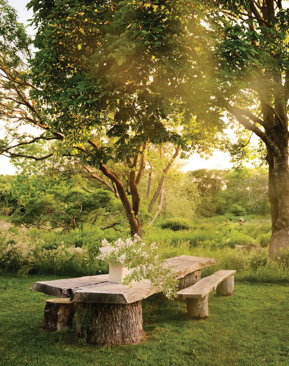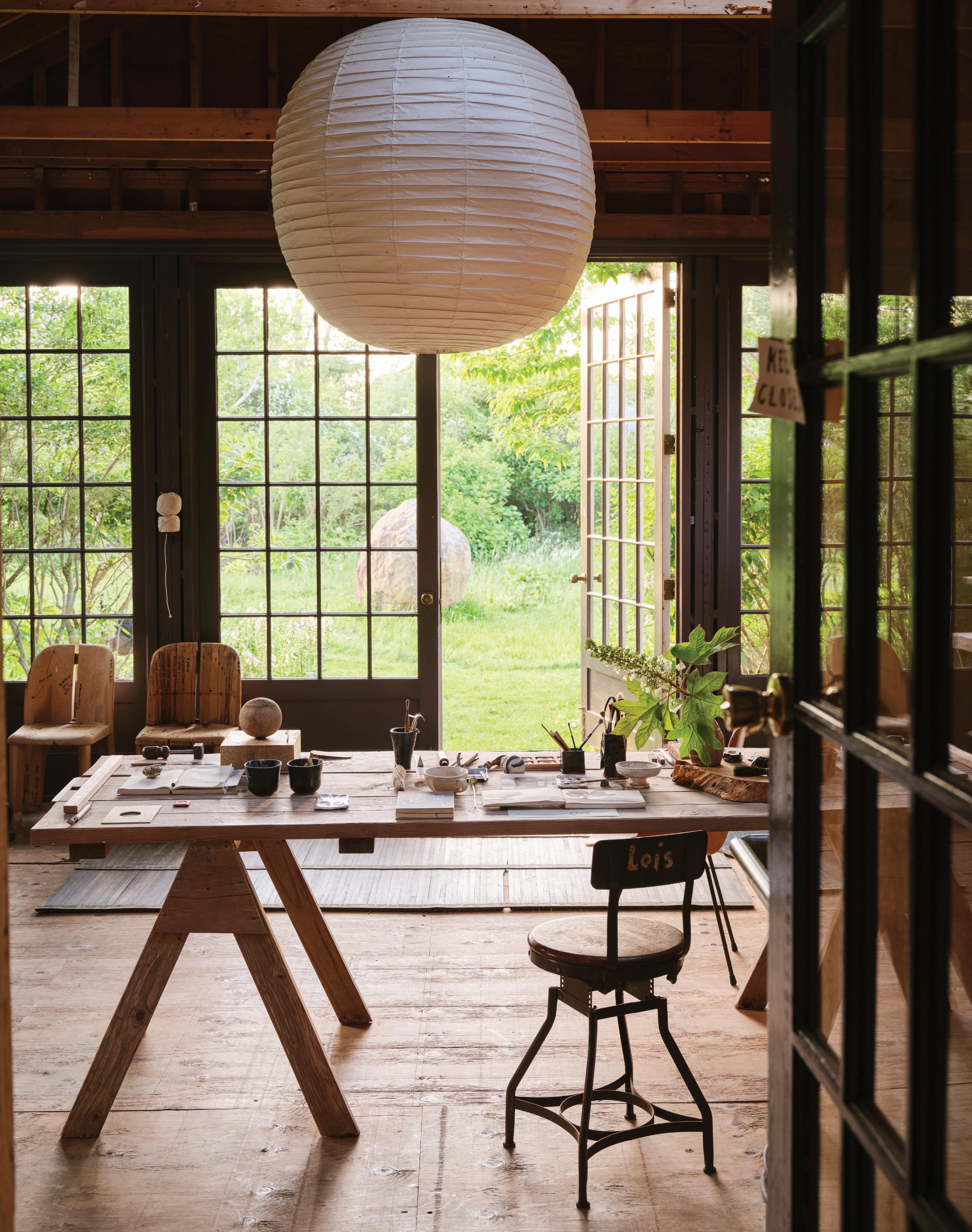 gathering spaces around the world, from the Metropolitan Museum of Art’s British Galleries to London’s private club Maison Estelle. They have also developed their own nature-infused furnishings collection, Roman and Williams Original Designs, which specializes in artisanal tables, chairs, and chandeliers, while building residences for aesthete celebrities like Gwyneth Paltrow. Their SoHo shop, Roman and Williams Guild Original Designs, sells their original designs alongside tableware handmade by like-minded artists from around the world. Along the way, their hybrid home-workshop in Montauk has become the laboratory for everything they do. It’s where Alesch makes furniture prototypes and Standefer, a New York native, experiments with assemblage and ceramics. “These things just wouldn’t happen in the city because of the intensity there,” she says. Alesch adds, “We never have a conversation about the cost of things or margins in Montauk. That’s city talk.”