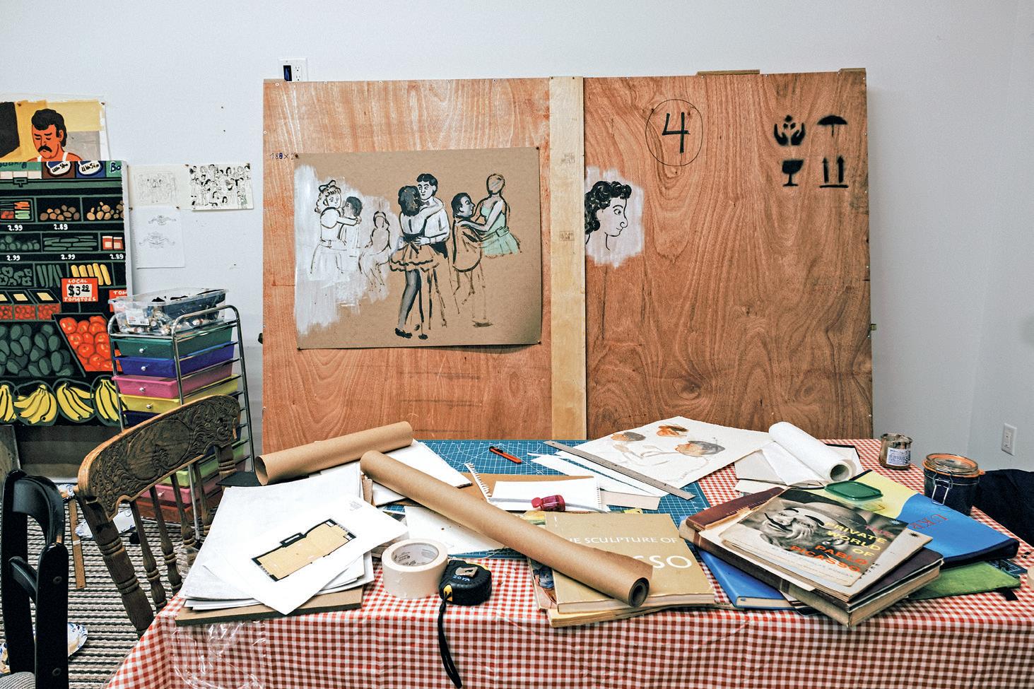 I started my adult life determined to be an artist. Then I came to New York, understood the realities of life, and found myself doing less and less art—not so much because of the need to work to survive, but because of how intimidated and out of place I felt in the art world at the time. I had a job at Artforum, but I didn’t think the art world had anything to do with my art. I definitely didn’t want to share my artwork at that point. It took me a while to realize, I don’t really care if people see this. I’m not there to impress someone—I just want to make something. Part of that stems from the place you go to when you make art. For me, it’s one of the few times I don’t think. Every morning, I get up and I draw while everyone’s asleep. And in the shed, I leave drawings out. I could care less if the boys are flipping through things. I’ve found beer cans left out on drawings, and I honestly don’t mind because it takes the preciousness out of it. There’s a living quality to it.
