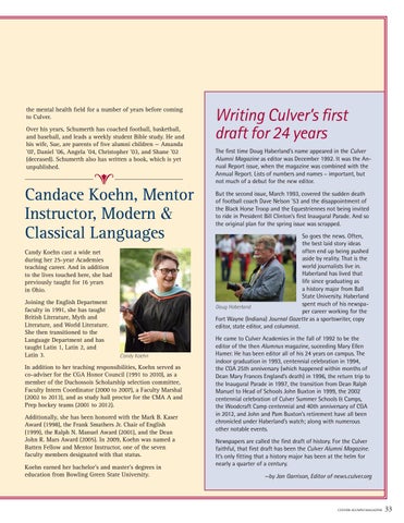 Writing Culver’s first draft for 24 years The first time Doug Haberland’s name appeared in the Culver Alumni Magazine as editor was December 1992. It was the Annual Report issue, when the magazine was combined with the Annual Report. Lists of numbers and names – important, but not much of a debut for the new editor. But the second issue, March 1993, covered the sudden death of football coach Dave Nelson ’53 and the disappointment of the Black Horse Troop and the Equestriennes not being invited to ride in President Bill Clinton’s first Inaugural Parade. And so the original plan for the spring issue was scrapped. So goes the news. Often, the best laid story ideas often end up being pushed aside by reality. That is the world journalists live in. Haberland has lived that life since graduating as a history major from Ball State University. Haberland spent much of his newspaDoug Haberland per career working for the Fort Wayne (Indiana) Journal Gazette as a sportswriter, copy editor, state editor, and columnist. He came to Culver Academies in the fall of 1992 to be the editor of the then Alumnus magazine, suceeding Mary Ellen Hamer. He has been editor all of his 24 years on campus. The indoor graduation in 1993, centennial celebration in 1994, the CGA 25th anniversary (which happened within months of Dean Mary Frances England’s death) in 1996, the return trip to the Inaugural Parade in 1997, the transition from Dean Ralph Manuel to Head of Schools John Buxton in 1999, the 2002 centennial celebration of Culver Summer Schools & Camps, the Woodcraft Camp centennial and 40th anniversary of CGA in 2012, and John and Pam Buxton’s retirement have all been chronicled under Haberland’s watch; along with numerous other notable events. Newspapers are called the first draft of history. For the Culver faithful, that first draft has been the Culver Alumni Magazine. It’s only fitting that a history major has been at the helm for nearly a quarter of a century. —by Jan Garrison, Editor of news.culver.org