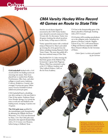 CGA hockey will be sending several players on to the collegiate ranks, including two players to Division I schools. Meghan Grieves (Cary, N.C.) will attend Boston College and Shawna Lesperance (Belle River, Ontario) will play for the University of Maine. Culver Sports is written and compiled by Jan Garrison