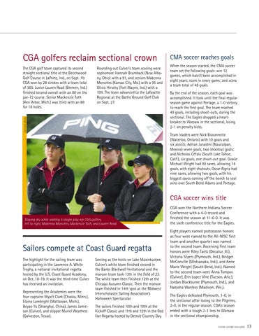 CMA soccer reaches goals When the season started, the CMA soccer team set the following goals: win 12 games, which hasn’t been accomplished in eight years; score in every game; and score a team total of 48 goals. By the end of the season, each goal was accomplished. It took until the final regular season game against Portage, a 1-0 victory, to reach the first goal. The team reached 49 goals, including shoot-outs, during the sectional. The Eagles dropped a heartbreaker to Warsaw in the sectional, losing 2-1 on penalty kicks. Team leaders were Nick Bissonnette (Waterloo, Ontario) with 10 goals and six assists; Adrian Juraidini (Naucalpan, Mexico) seven goals, two shootout goals; and Nicholas Cefalu (South Lake Tahoe, Calif.), six goals, one shoot-out goal. Goalie Michael Wright had 90 saves, allowing 14 goals, with eight shutouts. Oscar Algria had nine saves, allowing two goals, with his biggest saves coming off the bench to seal wins over South Bend Adams and Portage.