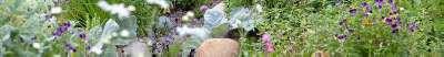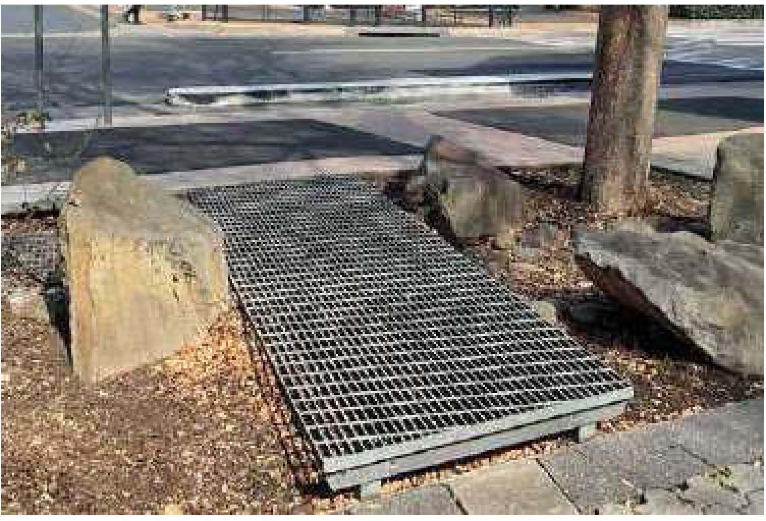 Existing grated walkways traverse planting zones adding element of nature play