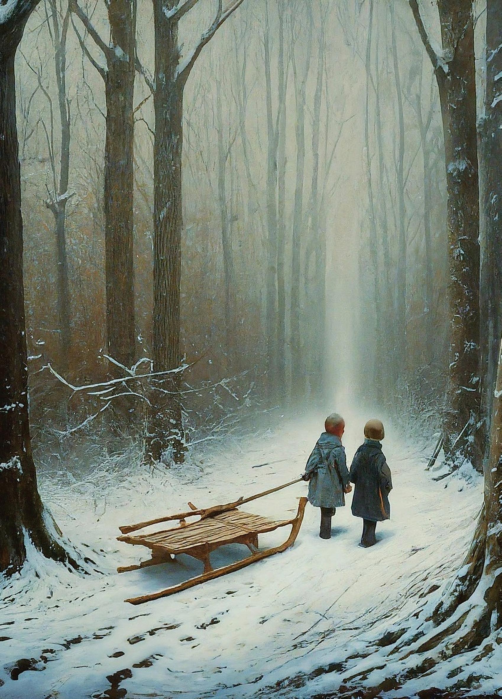 In the hush of a frostbitten, whispering wood, Two little figures stood. A sled behind them, worn but true, Trailed across the powdery blue.