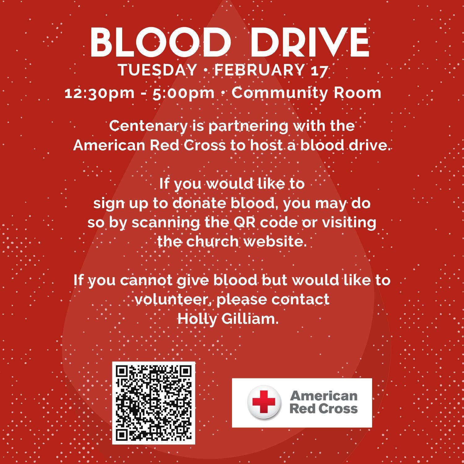 Centenary is partnering with the Red Cross to host a blood drive If you would like to sign up to donate blood, you may do so by scanning the QR code or visiting our website. If you cannot give blood but would like to volunteer, please contact Holly Gilliam, or check the website.