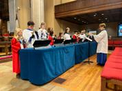 Upon entering the Sanctuary for the Service of Tenebrae, worshippers are acutely aware that something is different. During the Service of Holy Communion the previous evening, the chancel was stripped of the visible symbols of our faith, serving as a stark reminder of what is to come and as a symbol of the desolation, abandonment and darkness of Jesus’ Passion. Congregants see a central candle, representing the One who comes as light into our world of darkness, in front of a wooden cross. From this light of Christ, the candles representing the “seven words from the cross” are lit. After the narration directly preceding the crucifixion, each word is read, then sung, and a candle is extinguished. At the conclusion, the light of Christ is taken from the sanctuary, leaving us in darkness – the Tenebrae. After a few moments, the lighted candle is returned as a symbol of our hope for the Easter Resurrection. The cross is then draped in black, and the crown of thorns is placed upon it. The service ends, leaving those gathered with a sense of hope, as the Choir sings, “Christ, we do all adore Thee.”