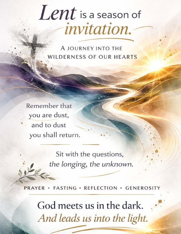 As we move through these forty days, we are invited to practices that help us dwell more fully in the wilderness: prayer that slows us down, fasting that helps us pay attention, acts of generosity that turn us outward and reflection that opens us to God’s shaping work. These practices are not meant to make us stronger or more disciplined, but more open – open to God’s grace, God’s truth, and God’s transforming love.