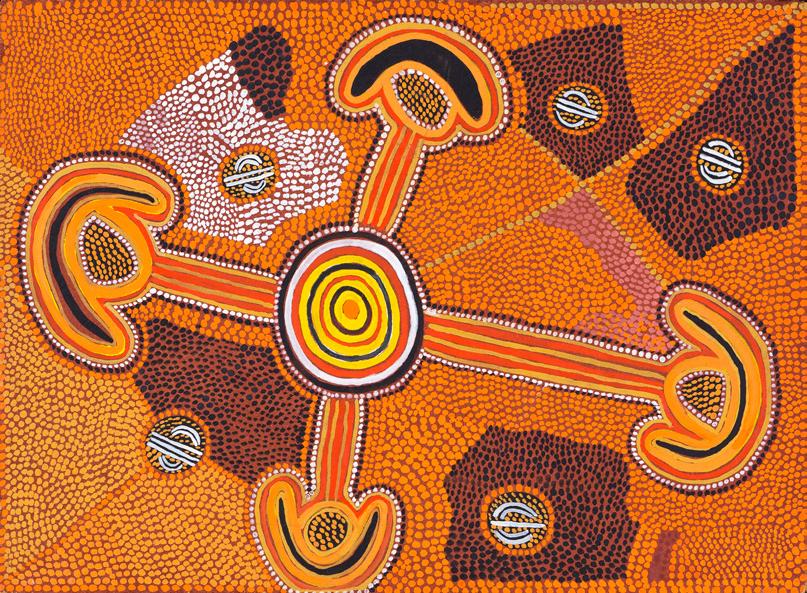 Mick Namarari Tjapaltjarri (Pintupi, 1926 - 1998), Family Moon Dreaming, 1977, synthetic polymer paint on composition board, 24 3/8 x 18 1/8 x 3/4 in., Gift of John W. and Maria T. Kluge, 2008, Kluge-Ruhe Aboriginal Art Collection of the University of Virginia, 2008.0003.001.