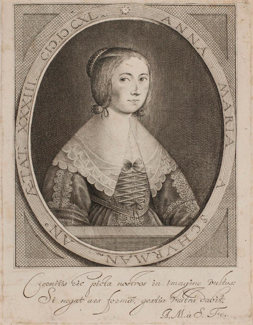 Anna Maria van Schurman (Dutch, 1607 – 1678), SelfPortrait, 1640, etching and engraving on laid paper, Krannert Art Museum purchase through the Iver M. Nelson, Jr. Fund, 2021-2-2 University of Illinois Urbana-Champaign.