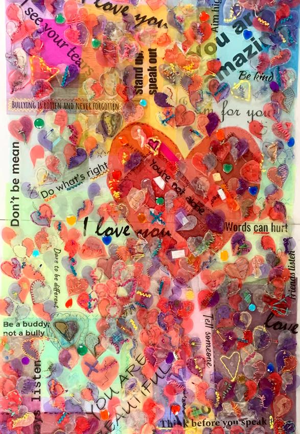 To mark National AntiBullying Week, ‘Healing Hearts’ was completed by each student in Year 3 - 8 as a collaborative piece of artwork. The hearts were laser cut from synthetic organza with the background word art reflecting our
