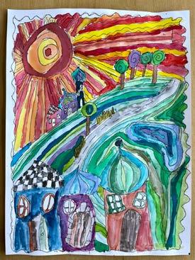 Year 3 created mixed media camouflage bug paintings, invented new species, and developed illustrations using squiggles, mystery tours, and stickers. They learned to sculpt clay pinch pots and designed skyscapes inspired by the Sussex ‘Northern Lights.’ Year 4 completed a project inspired by Mark Hearld, creating patterned and textured birds. They also crafted intricate textural backgrounds for mixed media seascapes using collage and recycled materials. Year 5 studied Hundertwasser, creating cities in his style using various media, including permanent pen, brusho inks, acrylic inks, and watercolours. Year 6 explored the work of Parisian animation artist Marine Buffard, recreating her diffused digital effects with hand-held diffusers and spray paint, resulting in impressive, detailed artwork. Year 7 focused on ‘pattern’ as a formal element, studying interlinking patterns, block printing techniques, and elaborate Art Deco and Art Nouveau textile designs from the 1920s and 1930s. And finally, Year 8 worked in small groups on transcription projects, producing a collection of acrylic landscapes as a parting gift to the school.