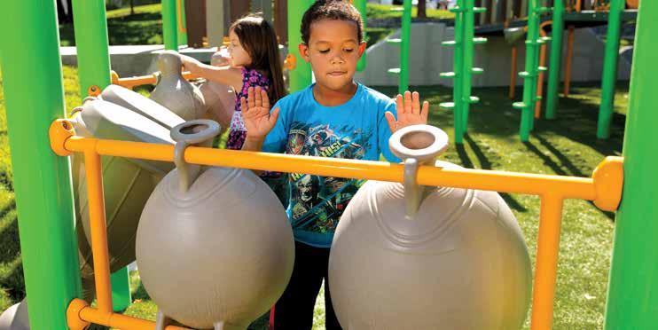 This playful space encourages children to explore a variety of sensory-rich features and freestanding motion and movement activities. These elements facilitate cooperative play and support motor planning and development to help children of all abilities comprehend and discover the world around them.