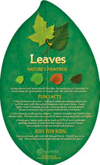Create the perfect entrance to your Play Trail with a custom trail map sign! This large sign is made of the same high quality recycled laminate used for the Fun Facts signs and retains the leaf shape that has become a symbol of the play trail. You provide the name of your trail, a map showing your play pockets and their location along the trail and we will create a personalized sign showcasing your community’s Play Trail.