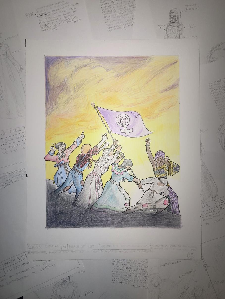 For this piece I co-opted the image of the marines raising the flag at Iwo-Jima, an image that has long symbolized resilience, teamwork, and strength in adversity. Qualities that I have seen expressed by the women in my life (with the same grit and fervor of those marines) in their fight to be seen and heard everyday. Each woman in the piece is in her traditional dress (researched as best as I could) to connect the long history of strong, fierce, and graceful women that have fought the good fight to give us a chance at make the world a better place A place demanding of equity, and intersectional understanding of the plight of women everywhere. With a sun rising in the distance, breaking the dawn of a new day where there is hope and abundant opportunity for change.