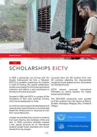SCHOLARSHIPS EICTV In 2016 a partnership was formed with the Escuela Internacional de Cine y TelevisiĂłn (EICTV) to establish scholarships for students in need of funding. This special collaboration heralds a new chapter for this Cuban educational institution and reflects a real commitment to the future of its Arts and youth. Founded in 1986, the EICTV is a project of the Foundation of New Latin American Cinema, which has its headquarters in Cuba. Its initial aim was to support the development of national audio-visual industries in countries that lacked the infrastructure or resources to train their own professionals. It began by providing free courses to students from Latin America, the Caribbean, Africa and Asia. In 2006, economic hardships imposed a fee- paying structure for all international students except Cuban attendees who remain exempt from any charges. - 43 -