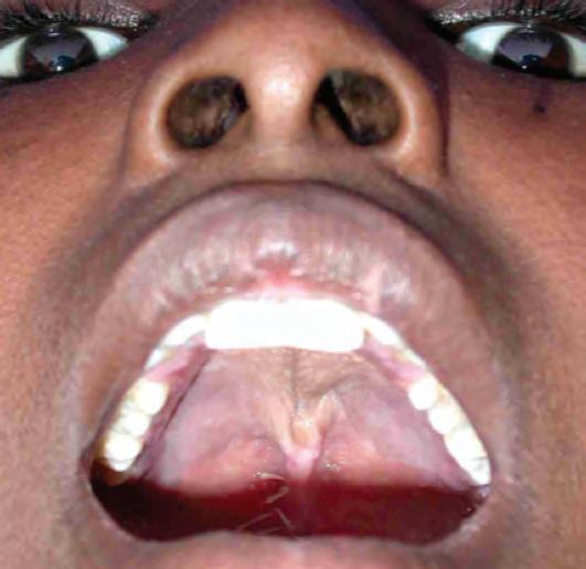 Classic noma lesion involving molars, canines and external incisors (three superiors and one inferior)
