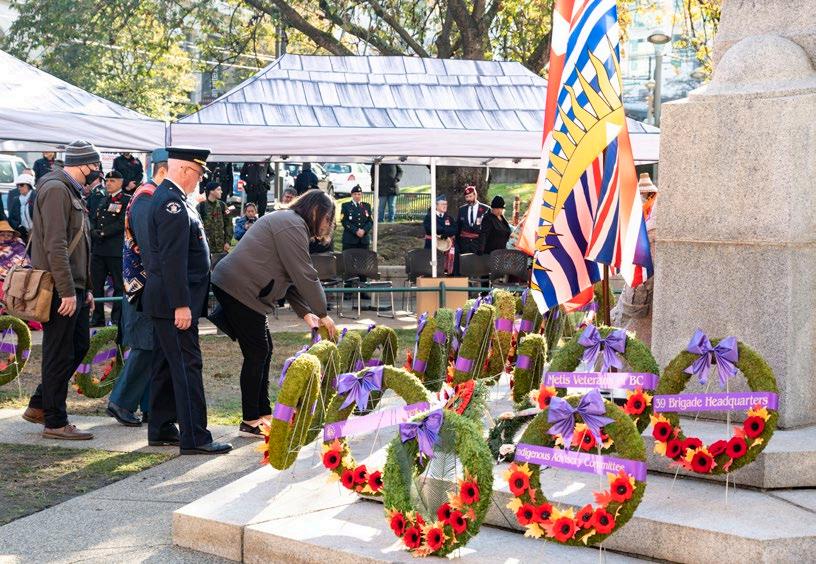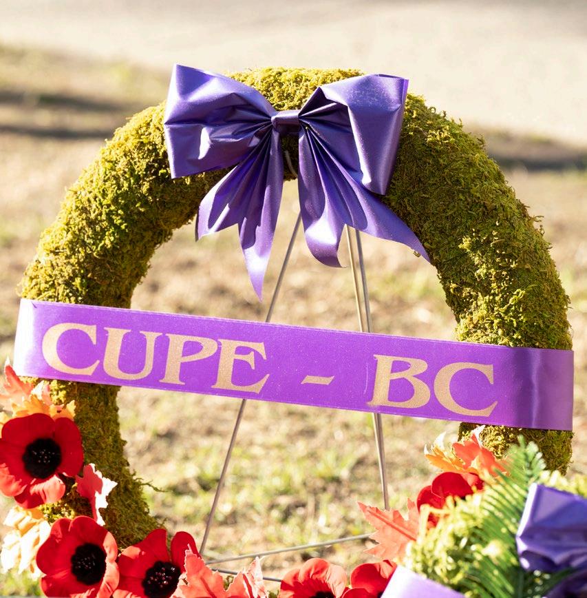 HONOURING INDIGENOUS VETERANS CUPE BC President Karen Ranalletta and CUPE 15 President Warren Williams accompanied CUPE 15 member, Elder Sam George, at a wreath-laying ceremony honouring the contributions of Indigenous war veterans on November 8.